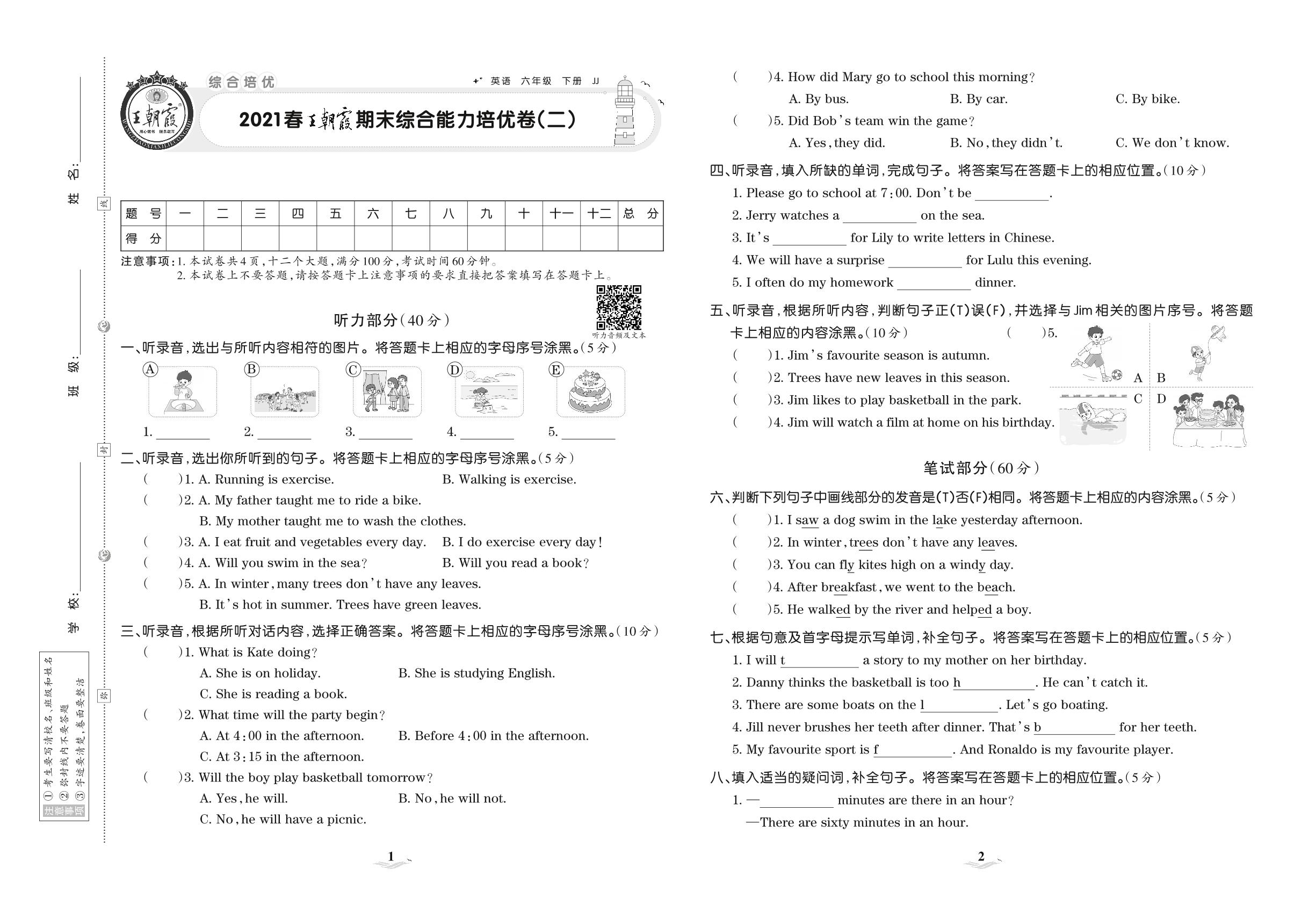 2021下册六年级英语冀教版 王朝霞期末综合能力培优卷(二)