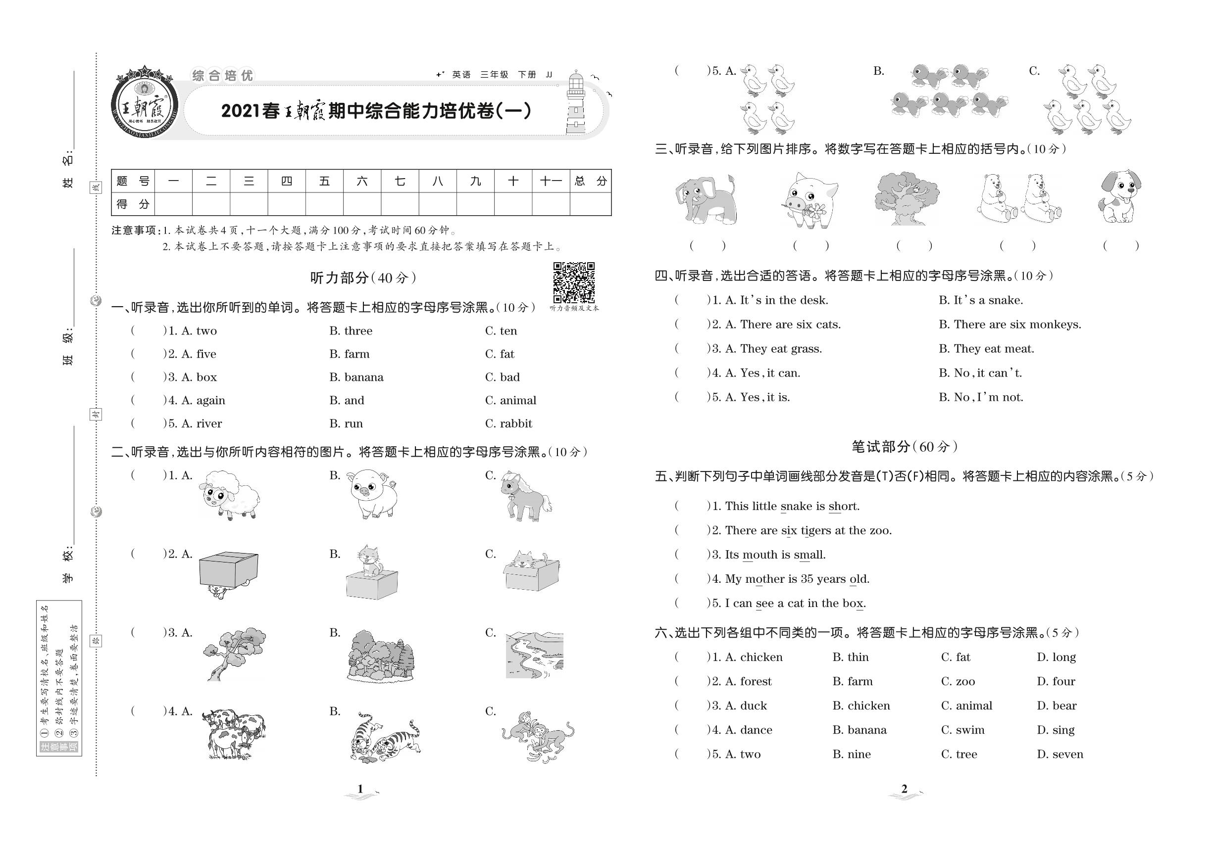 2021下册三年级英语冀教版 王朝霞期中综合能力培优卷(一)