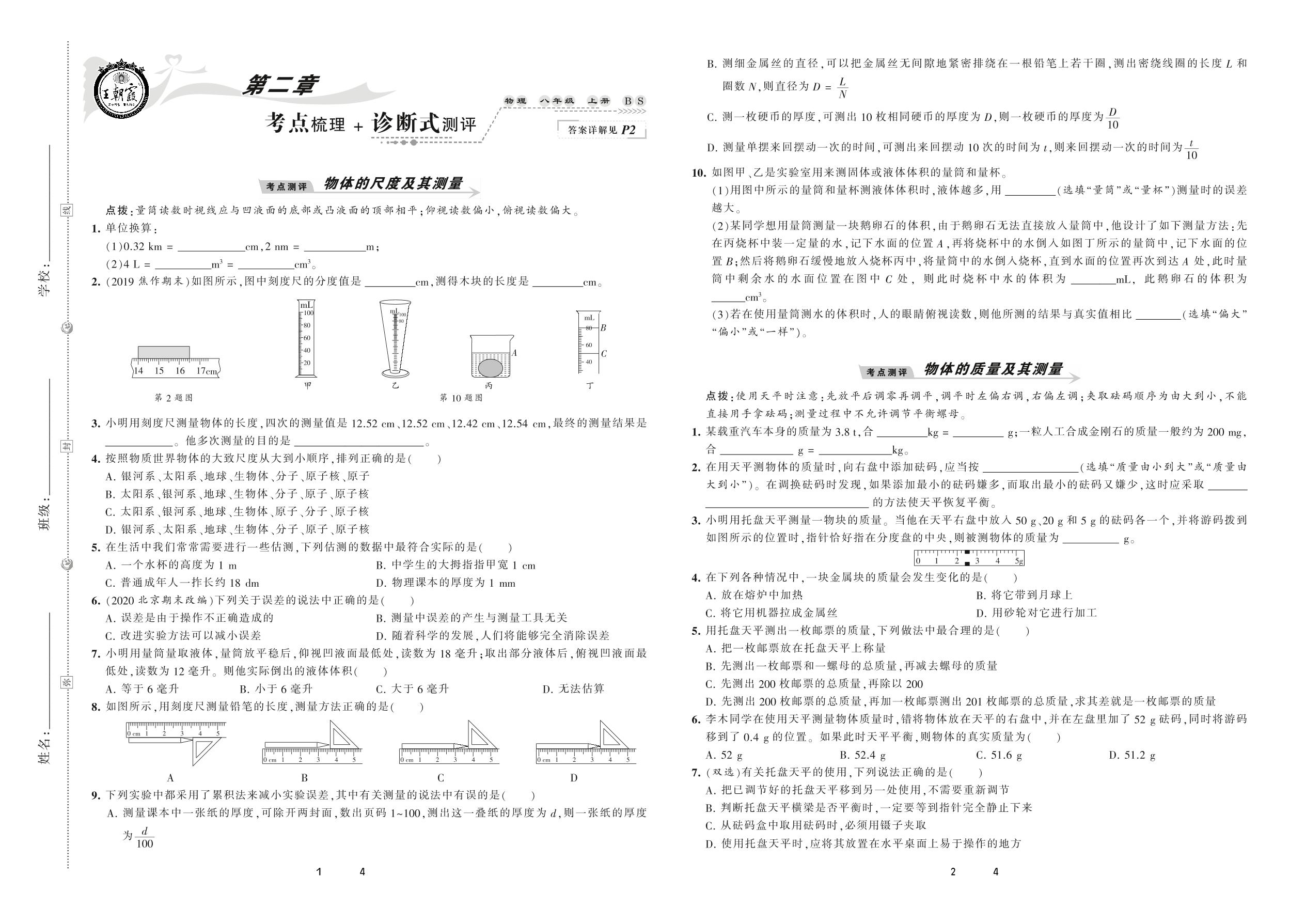 2020上册八年级物理北师版 第二章 考点梳理 + 诊断式测评