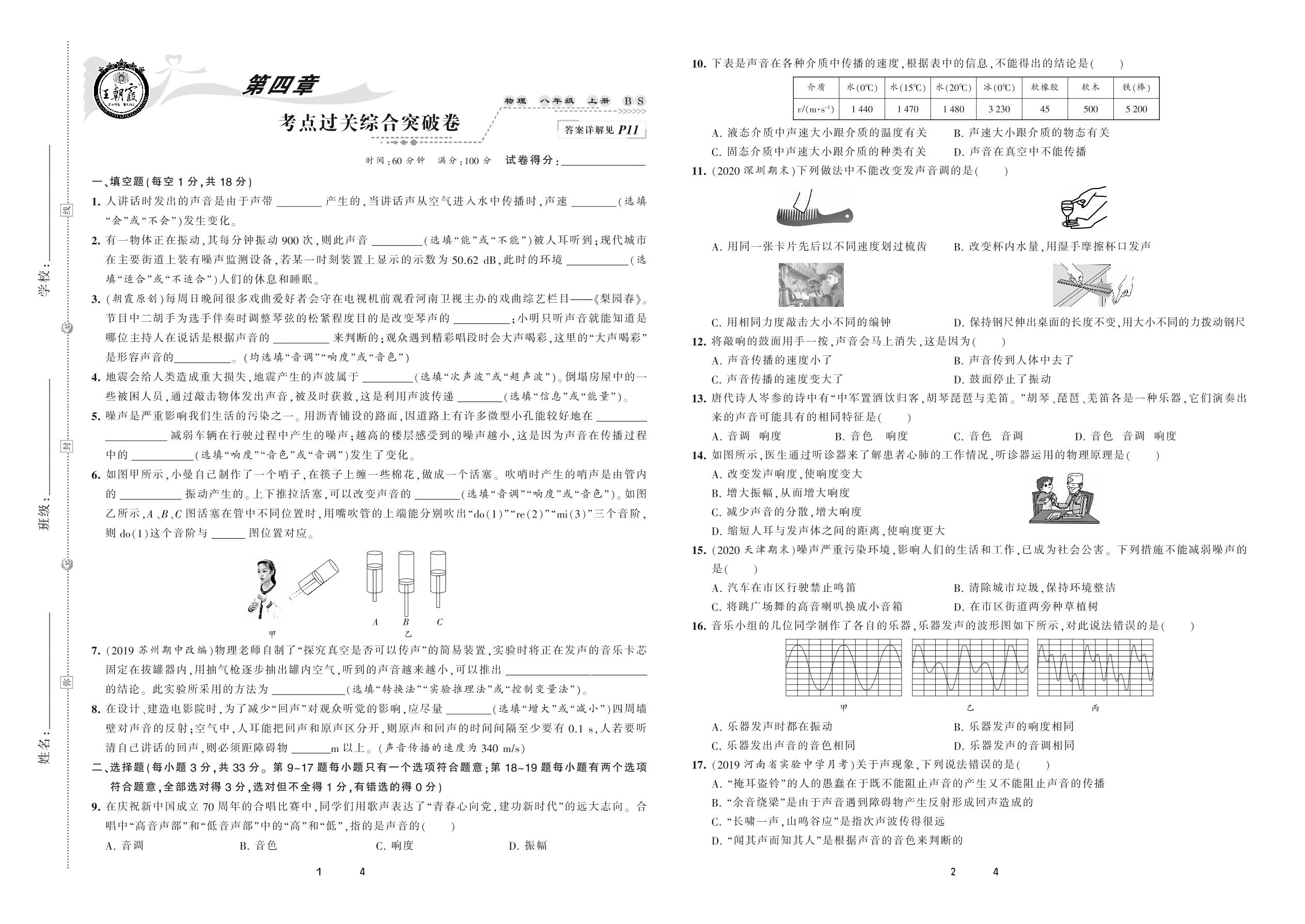 2020上册八年级物理北师版 第四章 考点过关综合突破卷