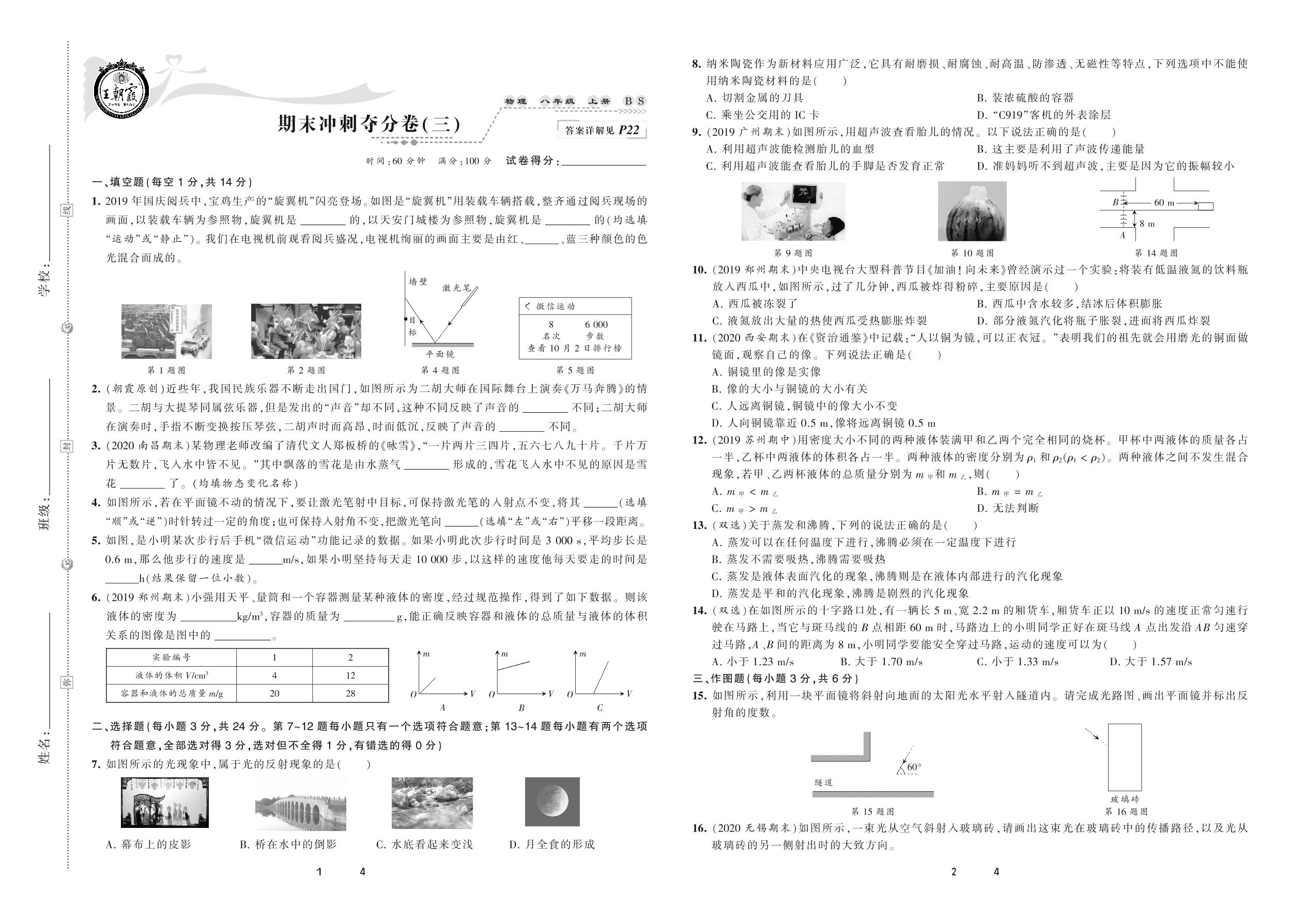 2020上册八年级物理北师版 期末冲刺夺分卷(三)