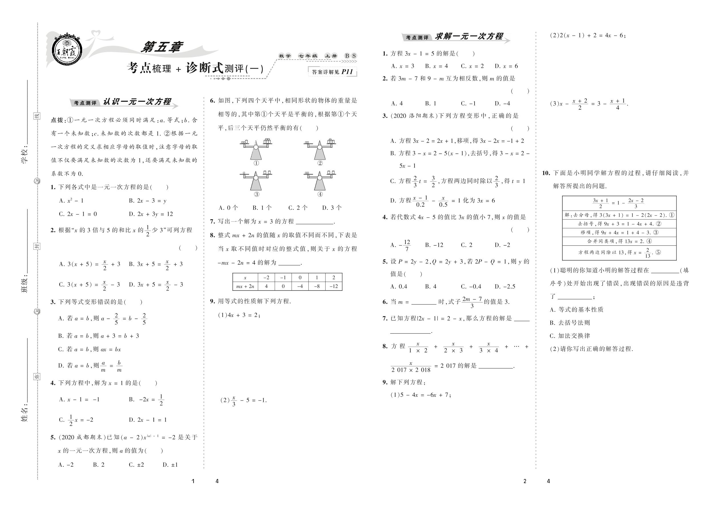 2020上册七年级数学北师版 第五章 考点梳理 + 诊断式测评(一)