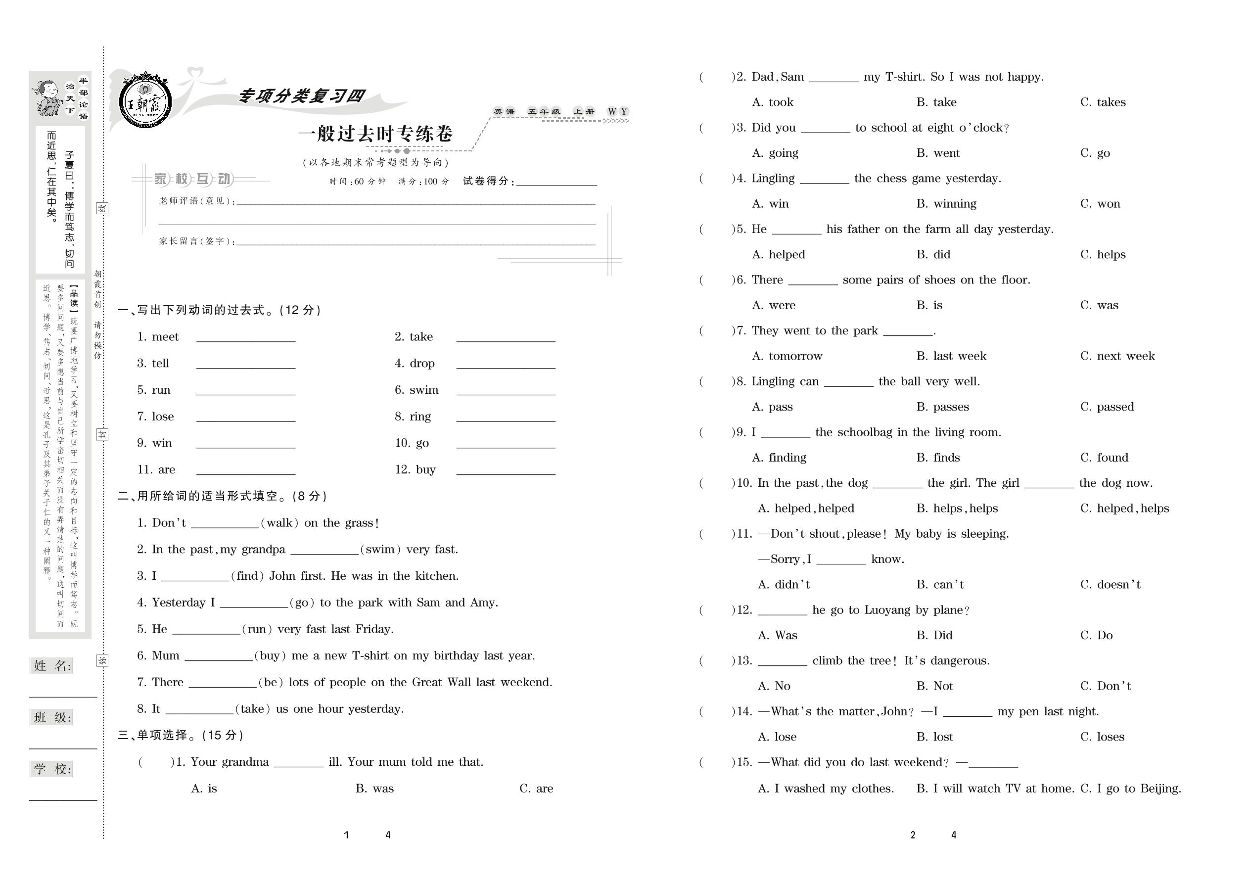 2020上册五年级英语外研版 一般过去时专练卷
