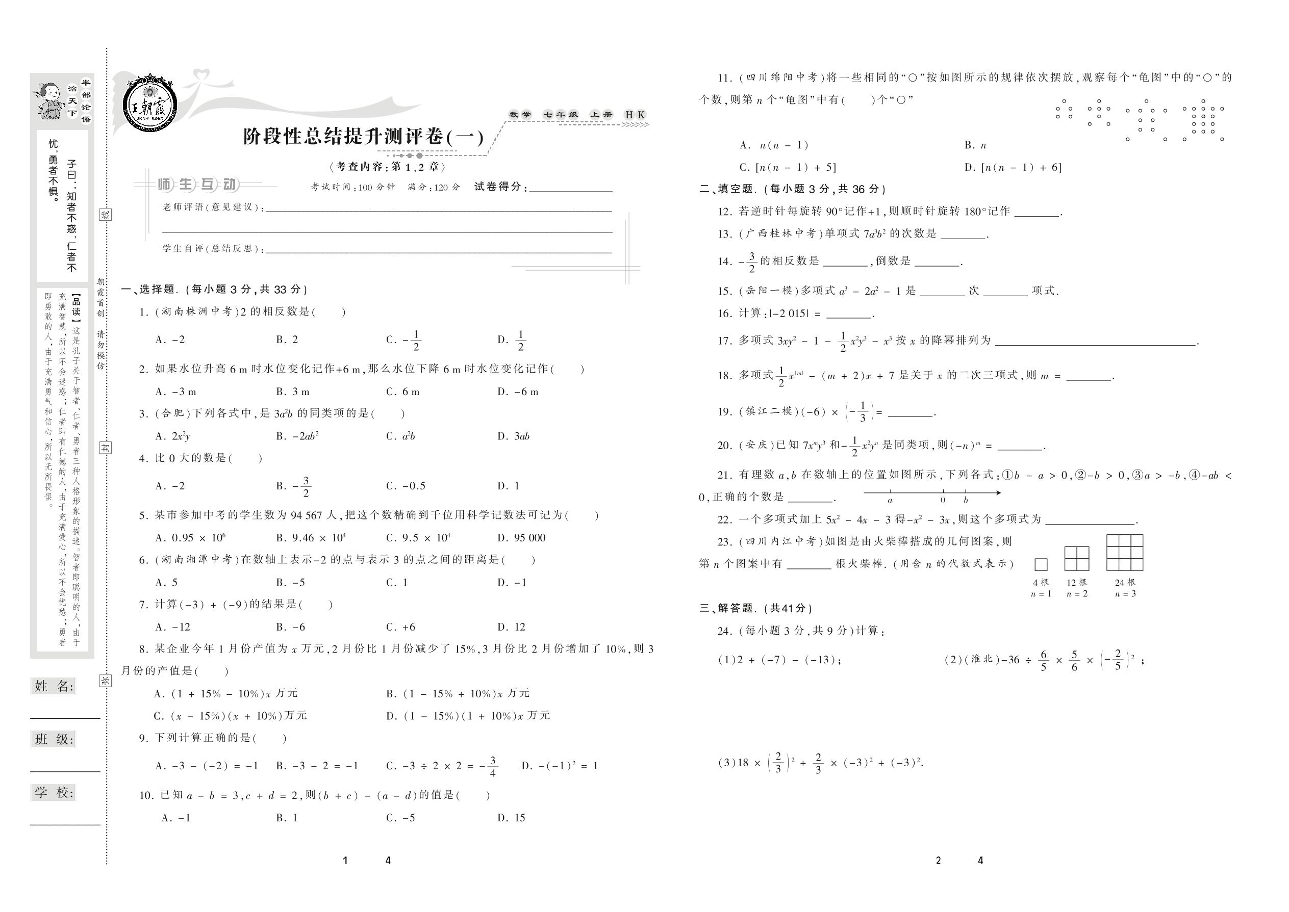 2020上册七年级数学沪科版 阶段性总结提升测评卷(一)