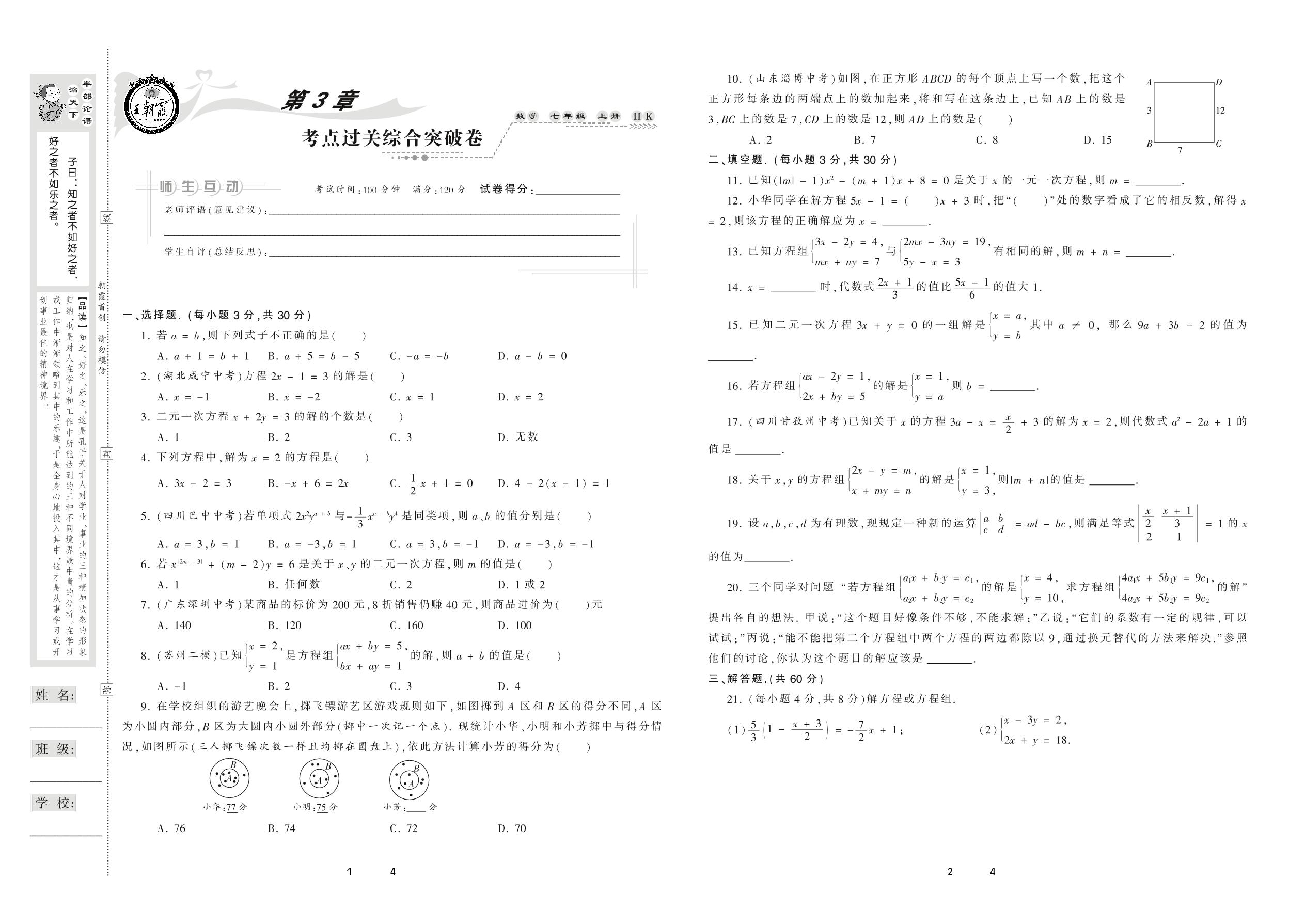 2020上册七年级数学沪科版 第3章 考点过关综合突破卷
