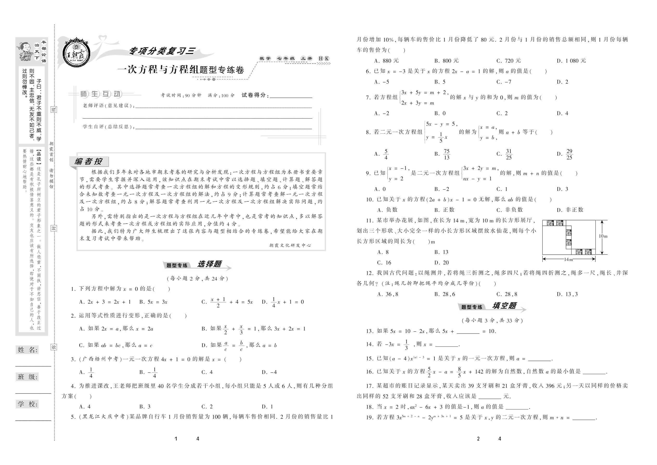 2020上册七年级数学沪科版 专项分类复习三 一次方程与方程组题型专练卷