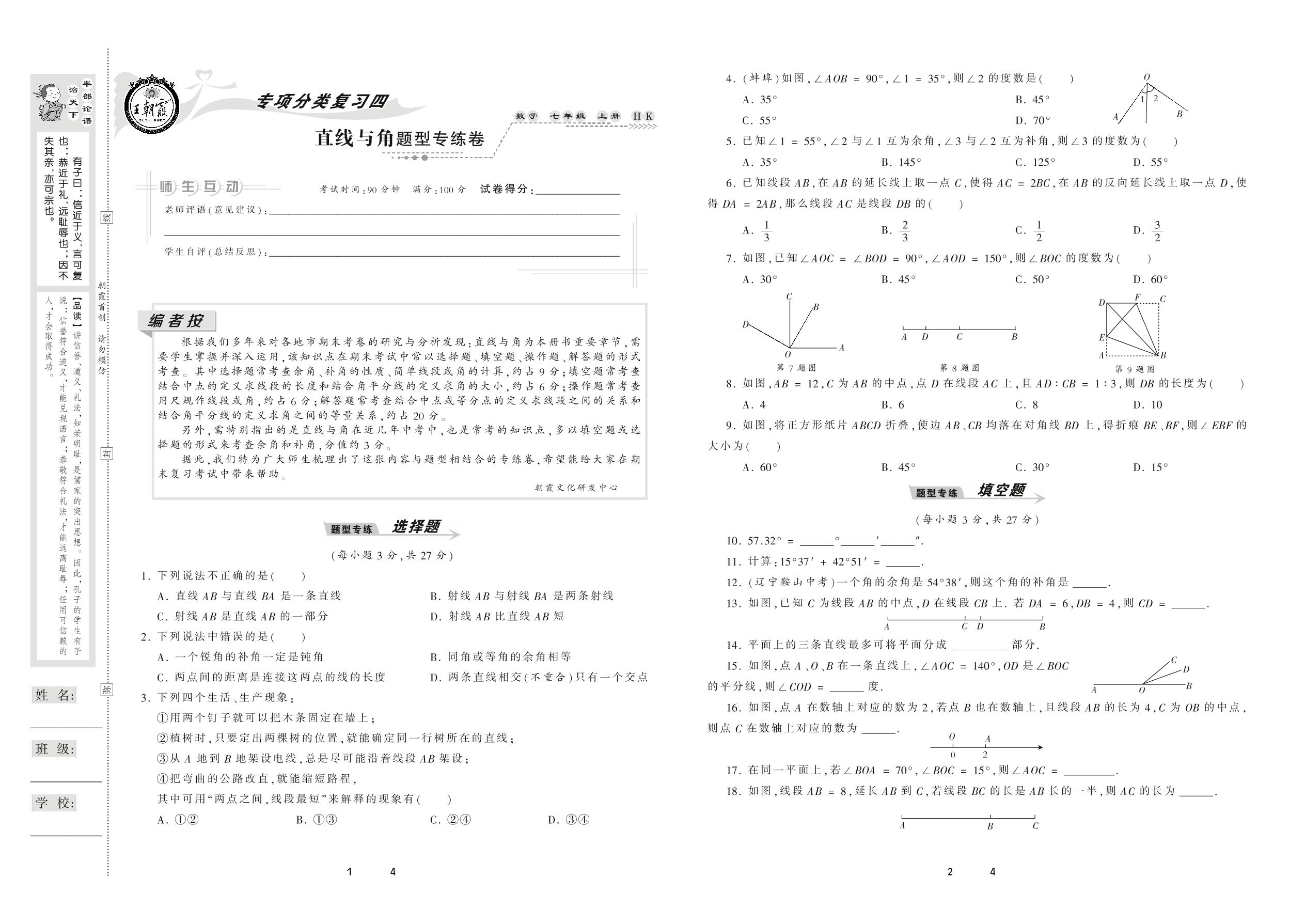 2020上册七年级数学沪科版 专项分类复习四 直线与角题型专练卷