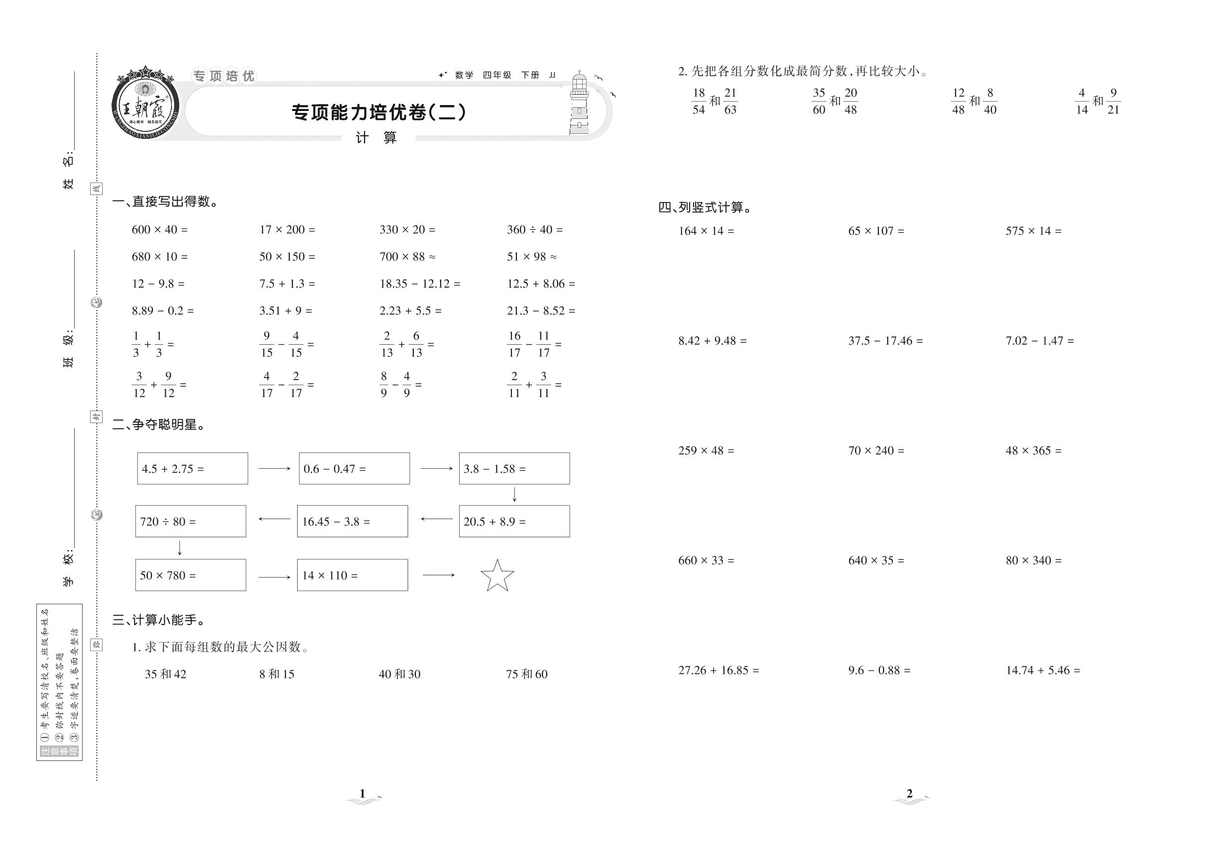 2021下册四年级数学冀教版 专项能力培优卷(二) 计算