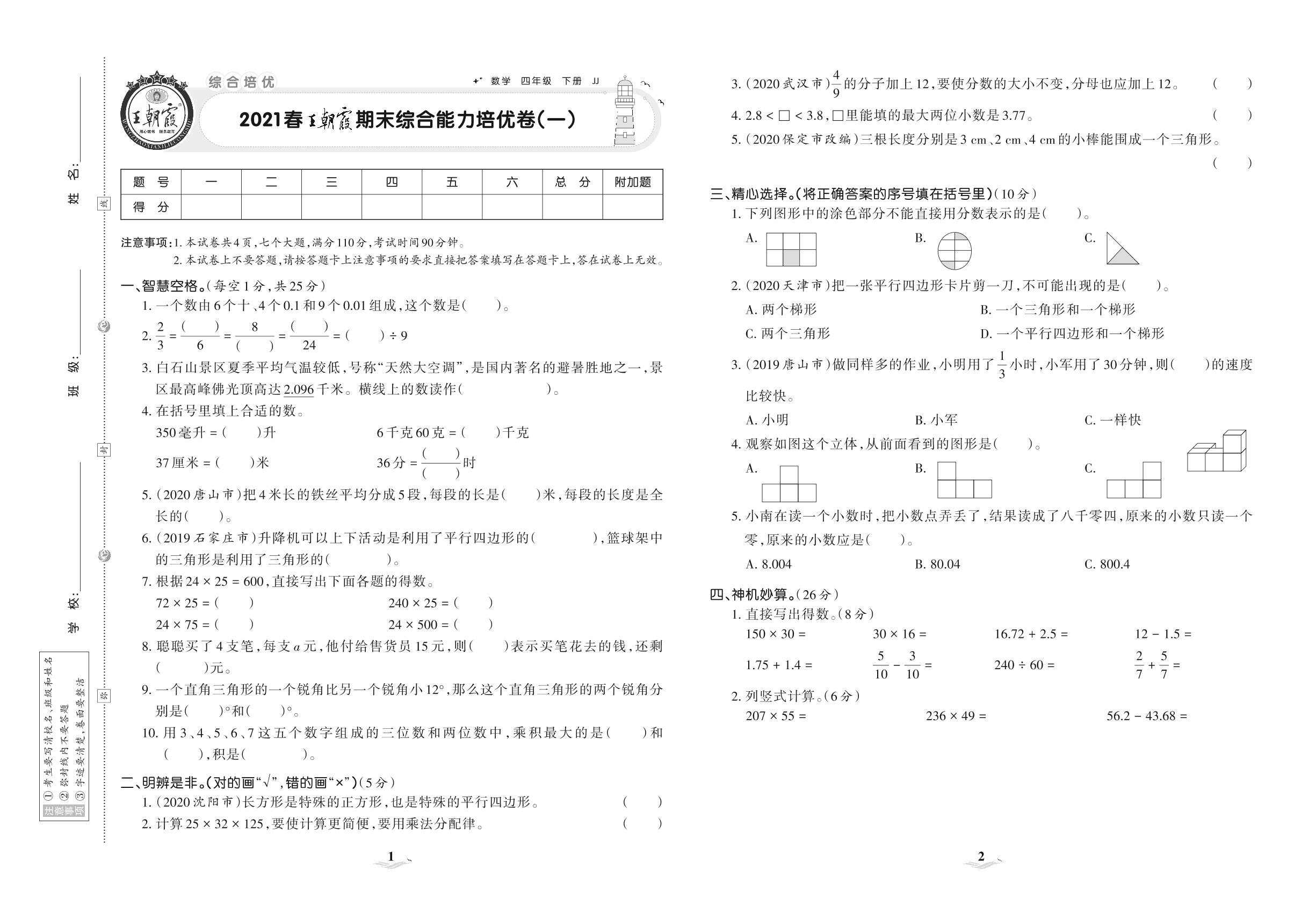 2021下册四年级数学冀教版 王朝霞期末综合能力培优卷(一)