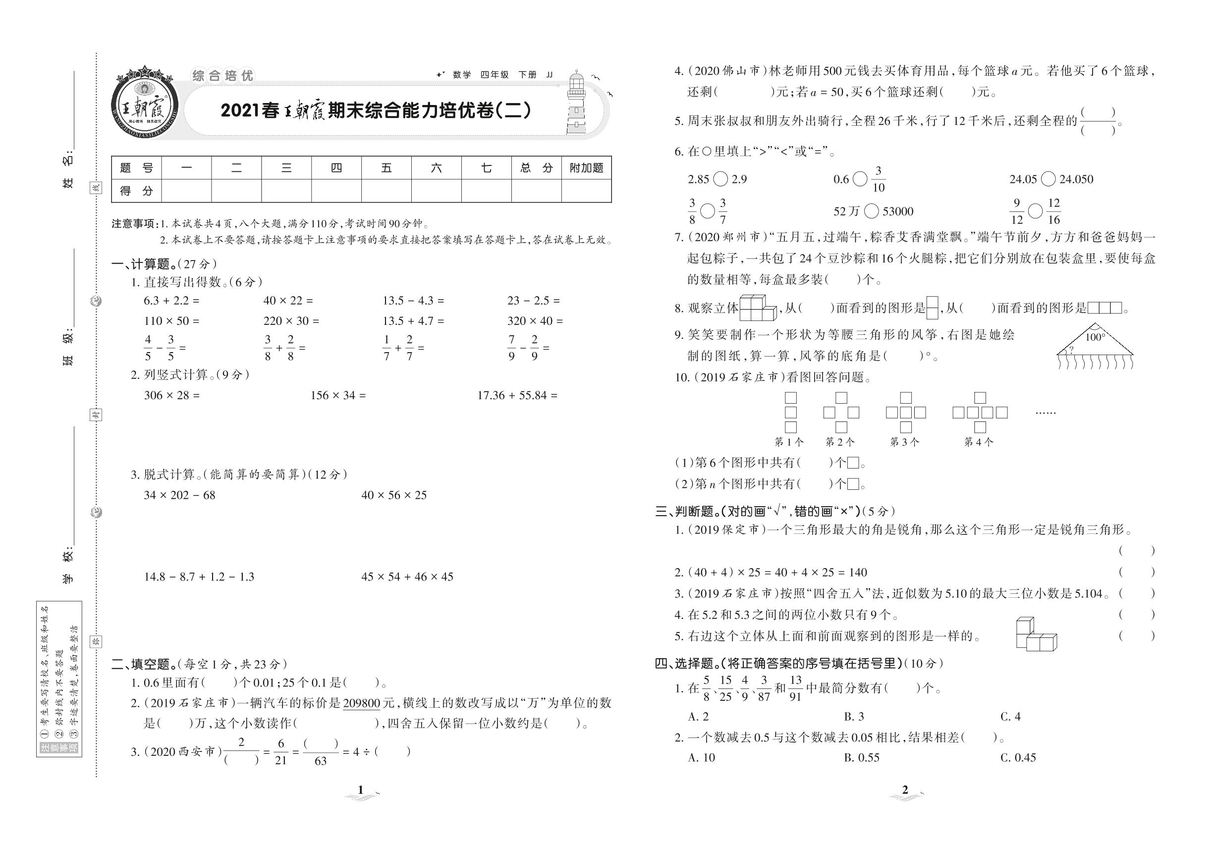 2021下册四年级数学冀教版 王朝霞期末综合能力培优卷(二)