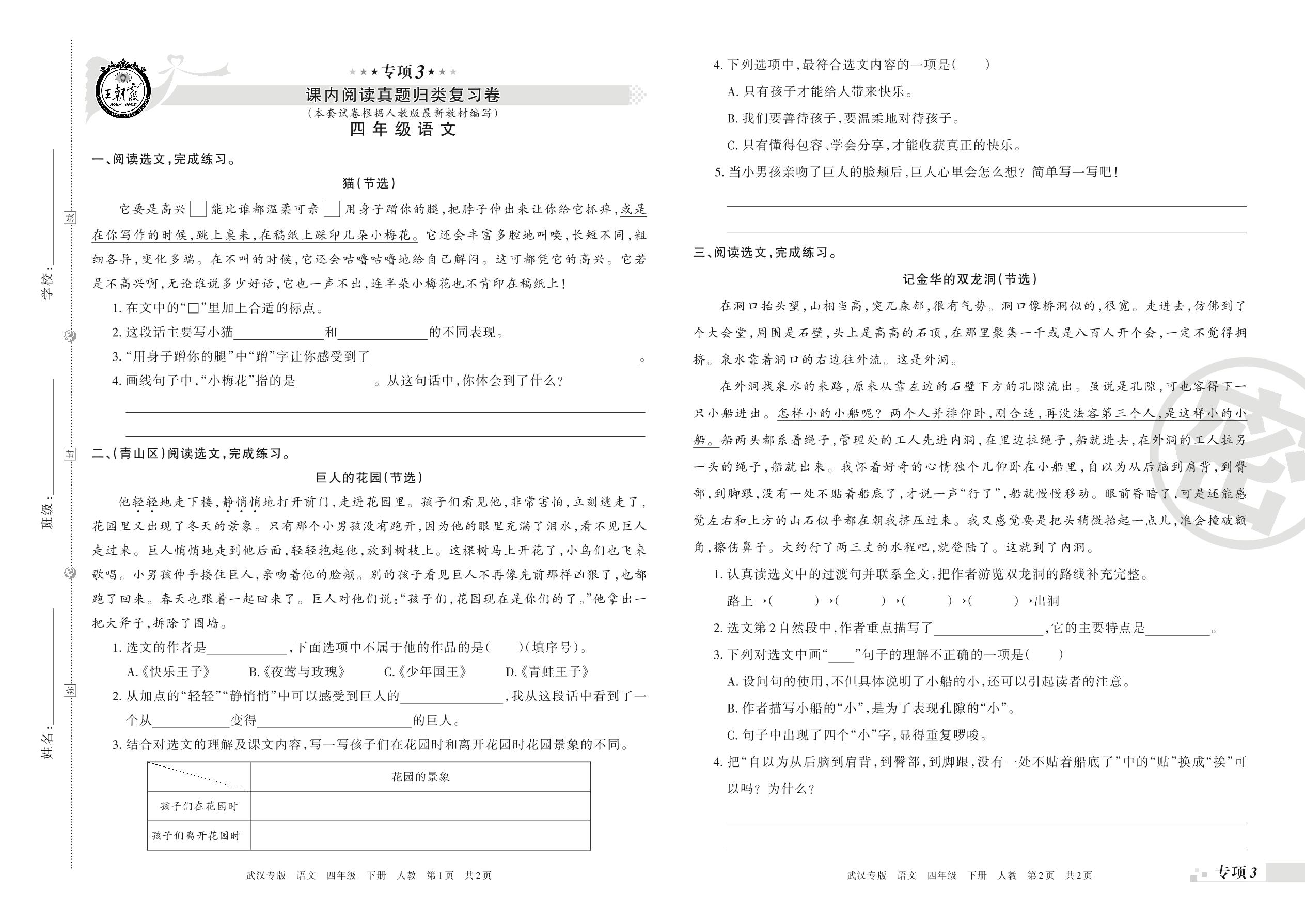 王朝霞期末专项卷——课内阅读、课外阅读真题归类复习四年级下册语文(人教版)_R210801183546【0】