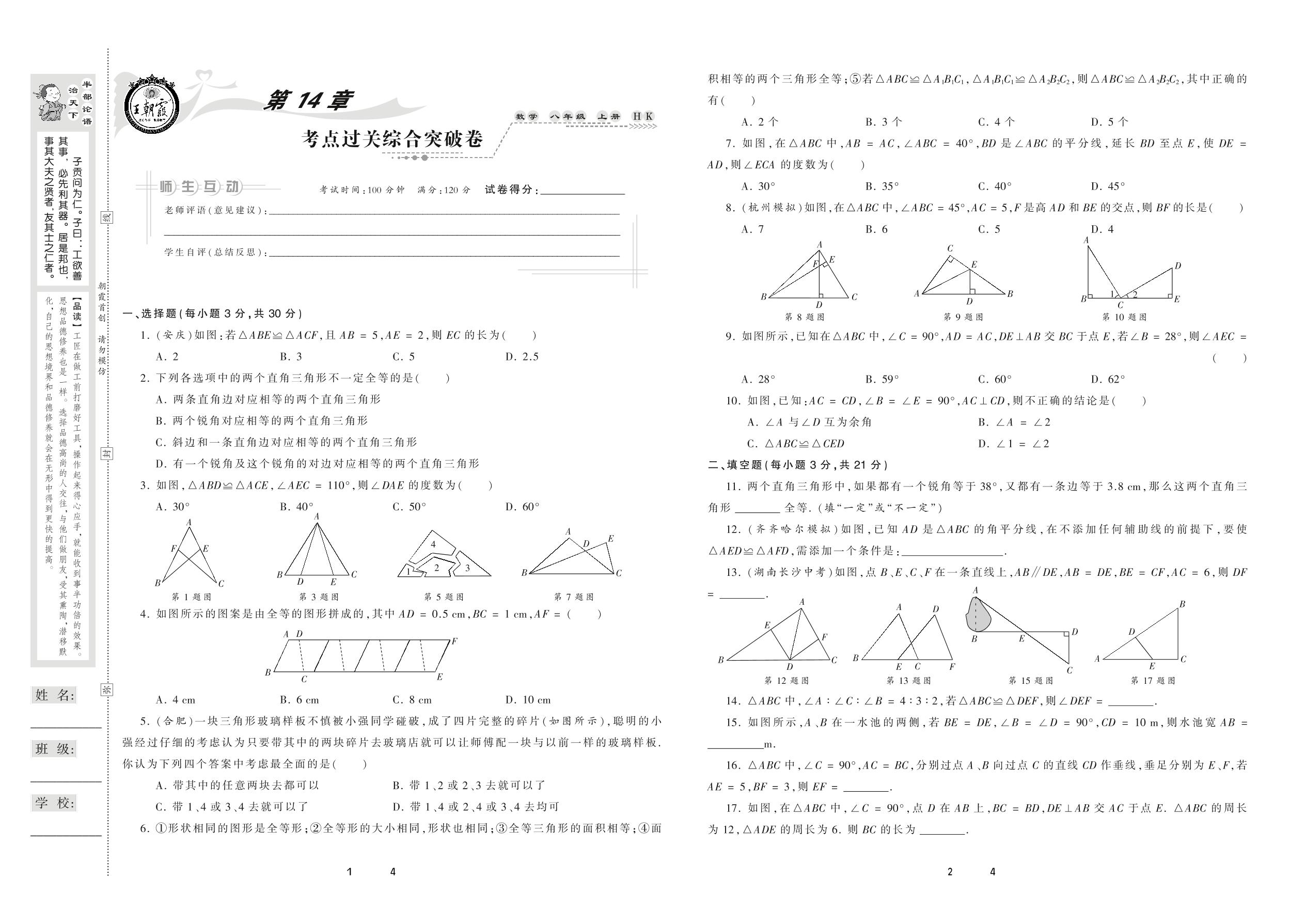 2020上册八年级数学沪科版 第14章 考点过关综合突破卷