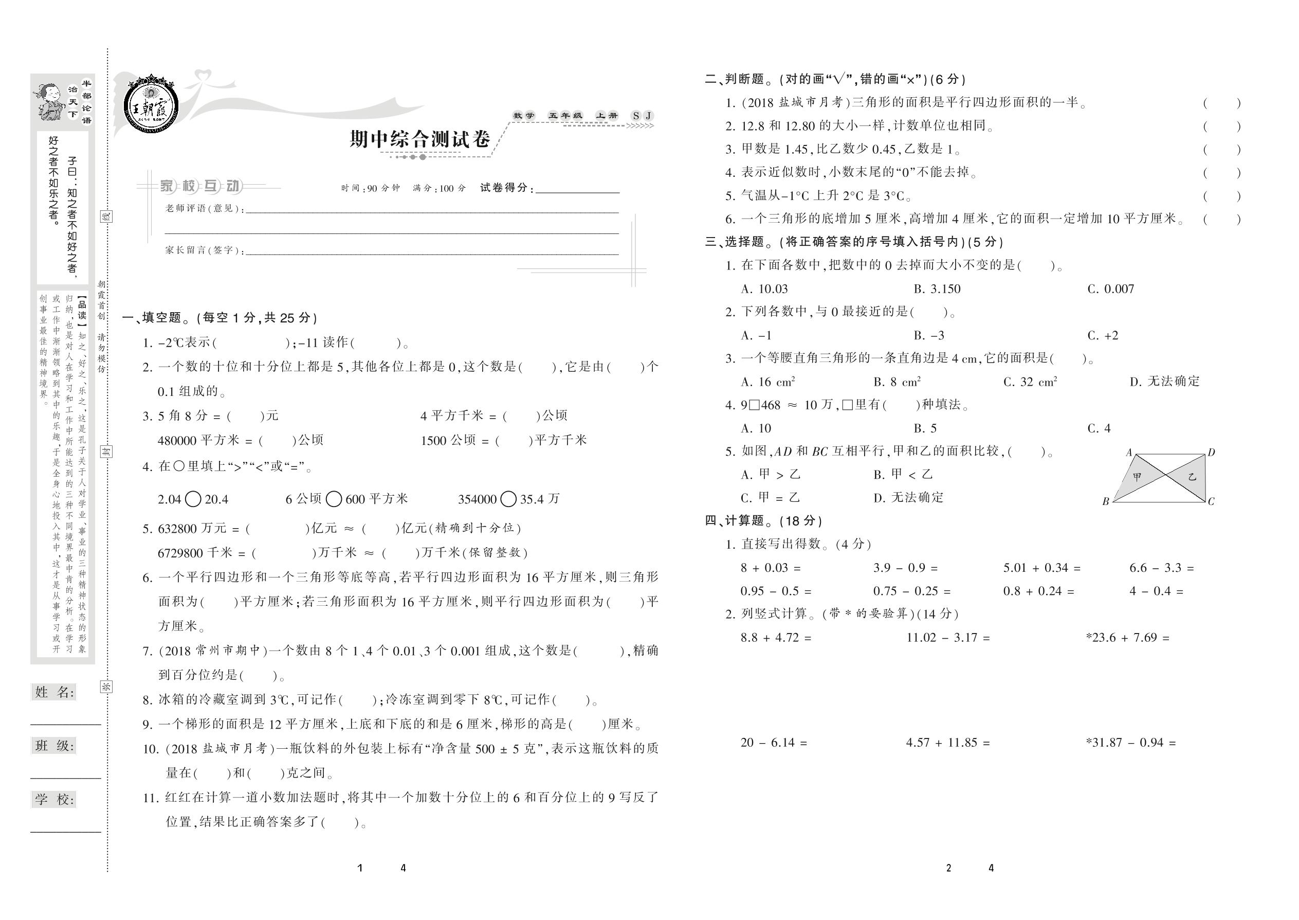 五年级数学苏教版上册期中卷