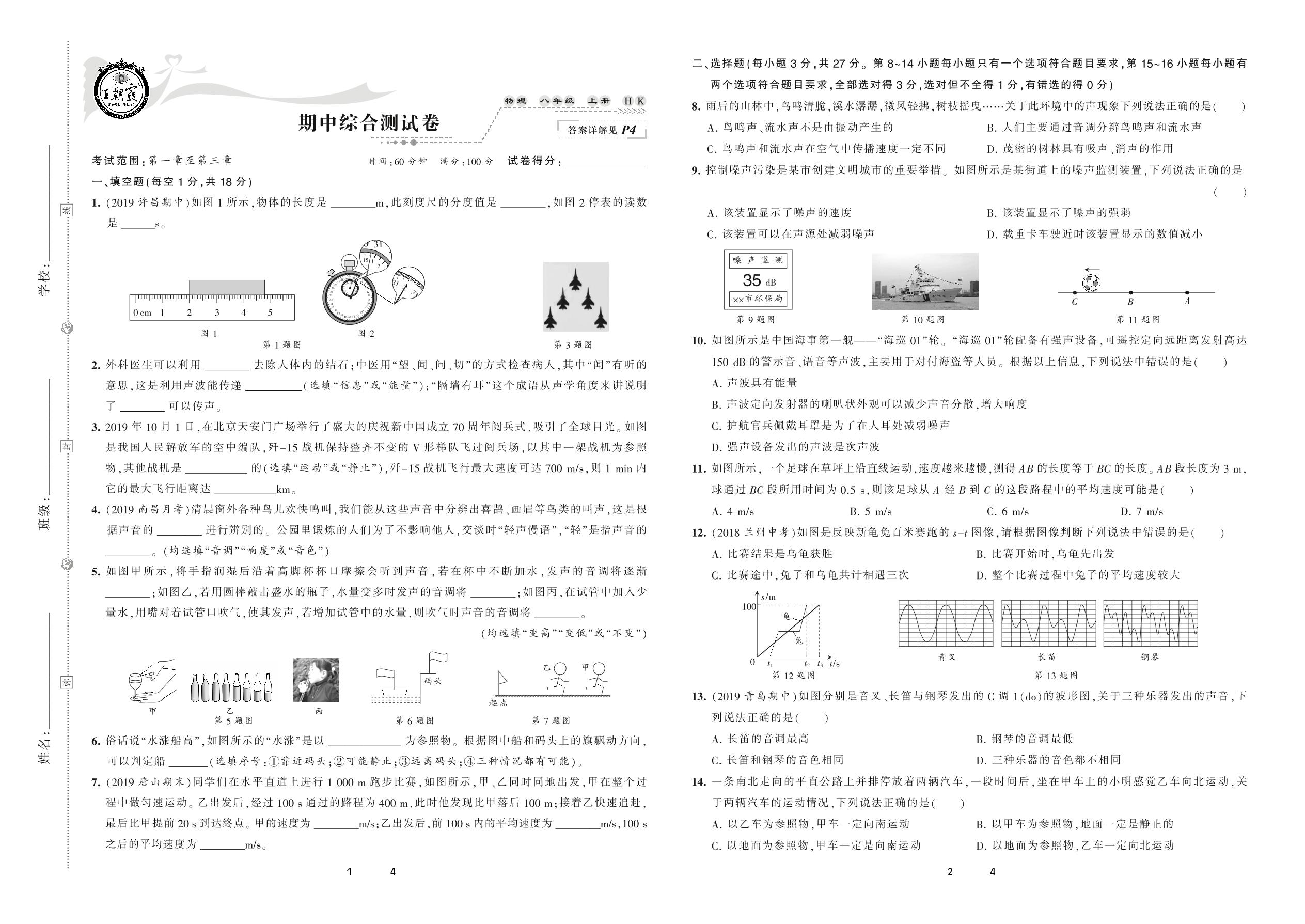 2020-2021学年第一学期八年级物理沪科版 期中综合测试卷