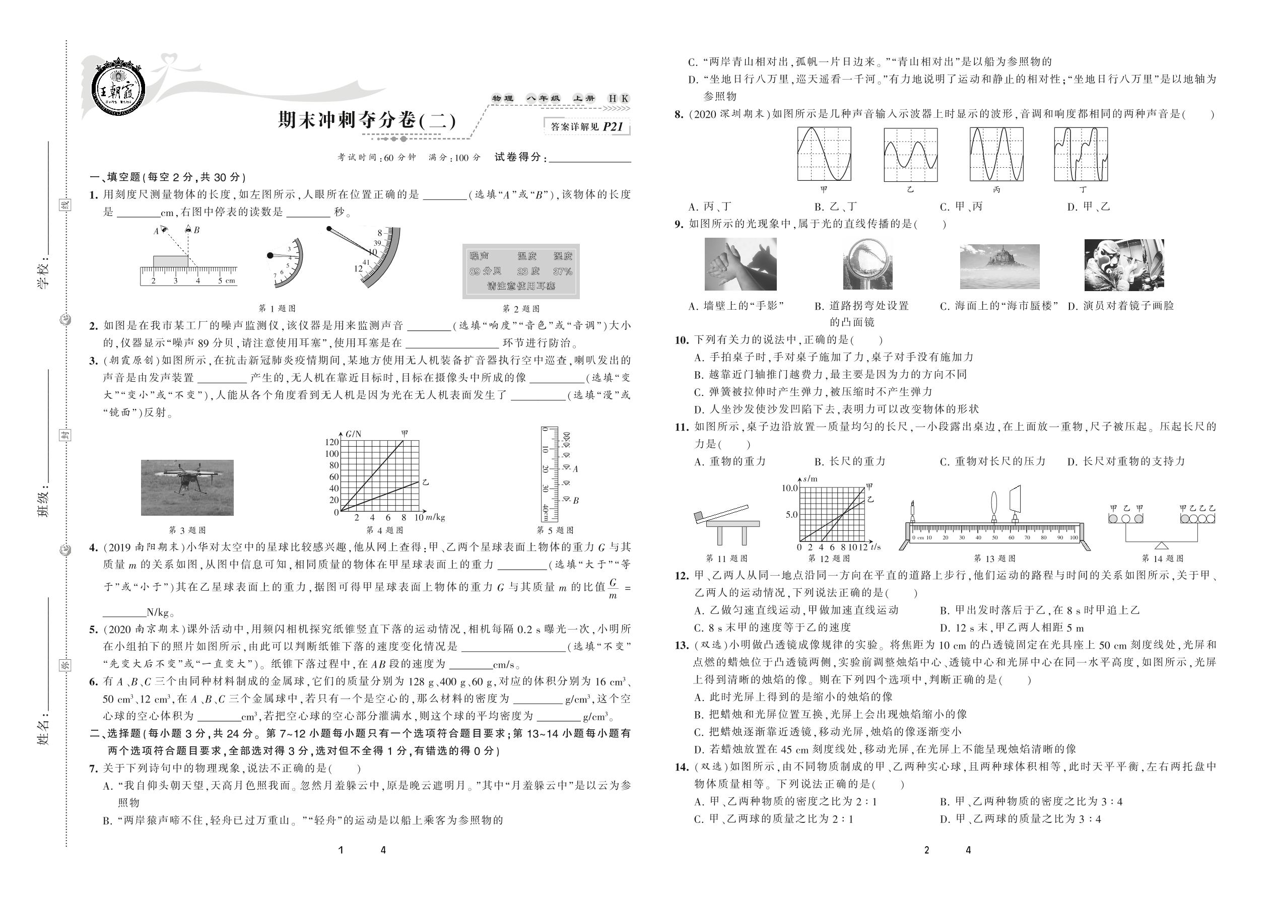 2020上册八年级物理沪科版 期末冲刺夺分卷(二)