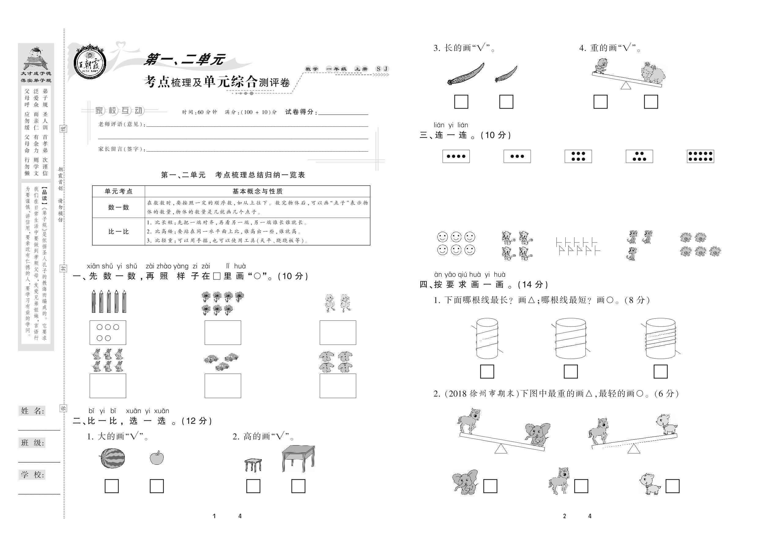 2020上册一年级数学苏教版 第一、二单元 考点梳理及单元综合测评卷