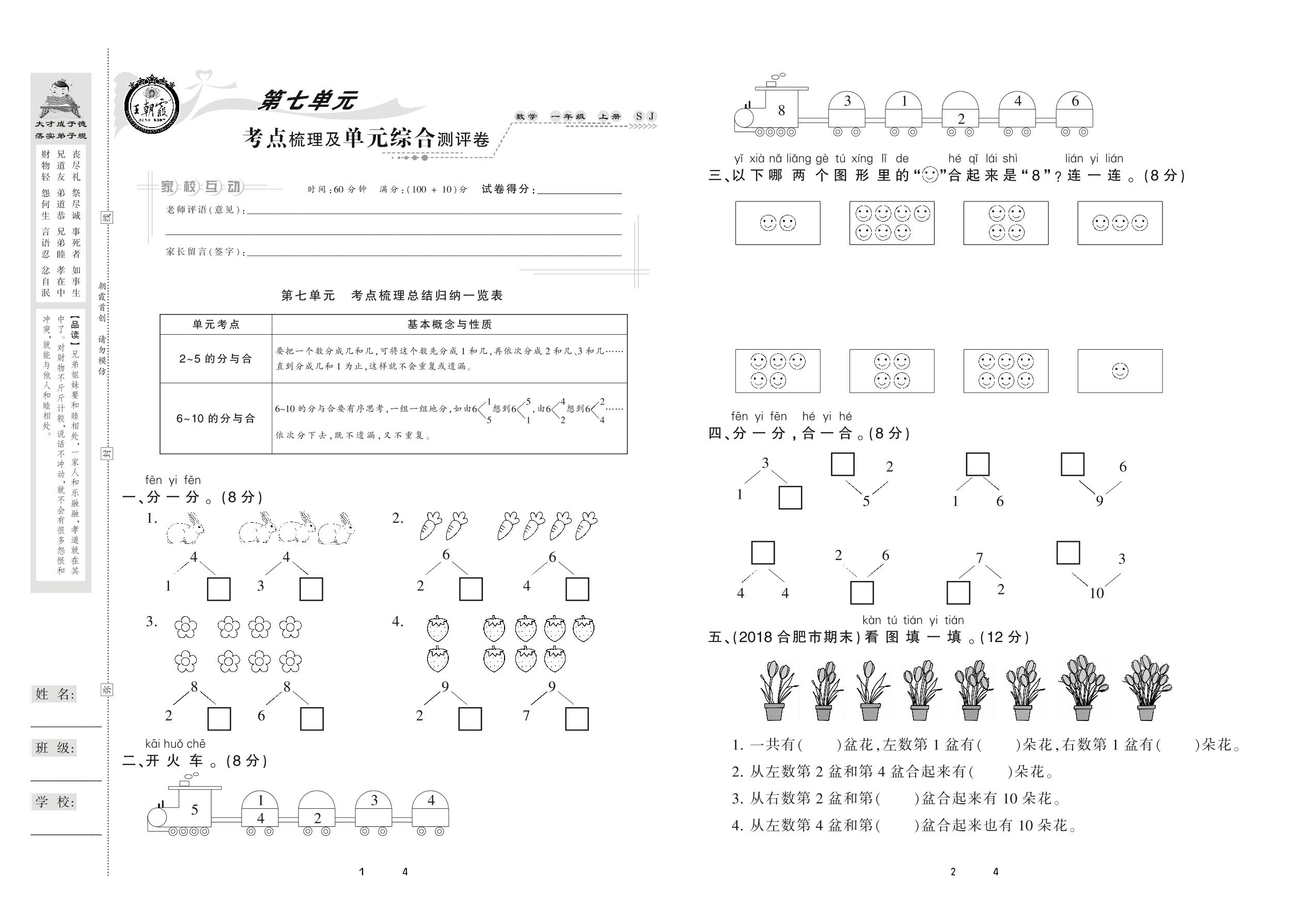 2020上册一年级数学苏教版 第七单元 考点梳理及单元综合测评卷
