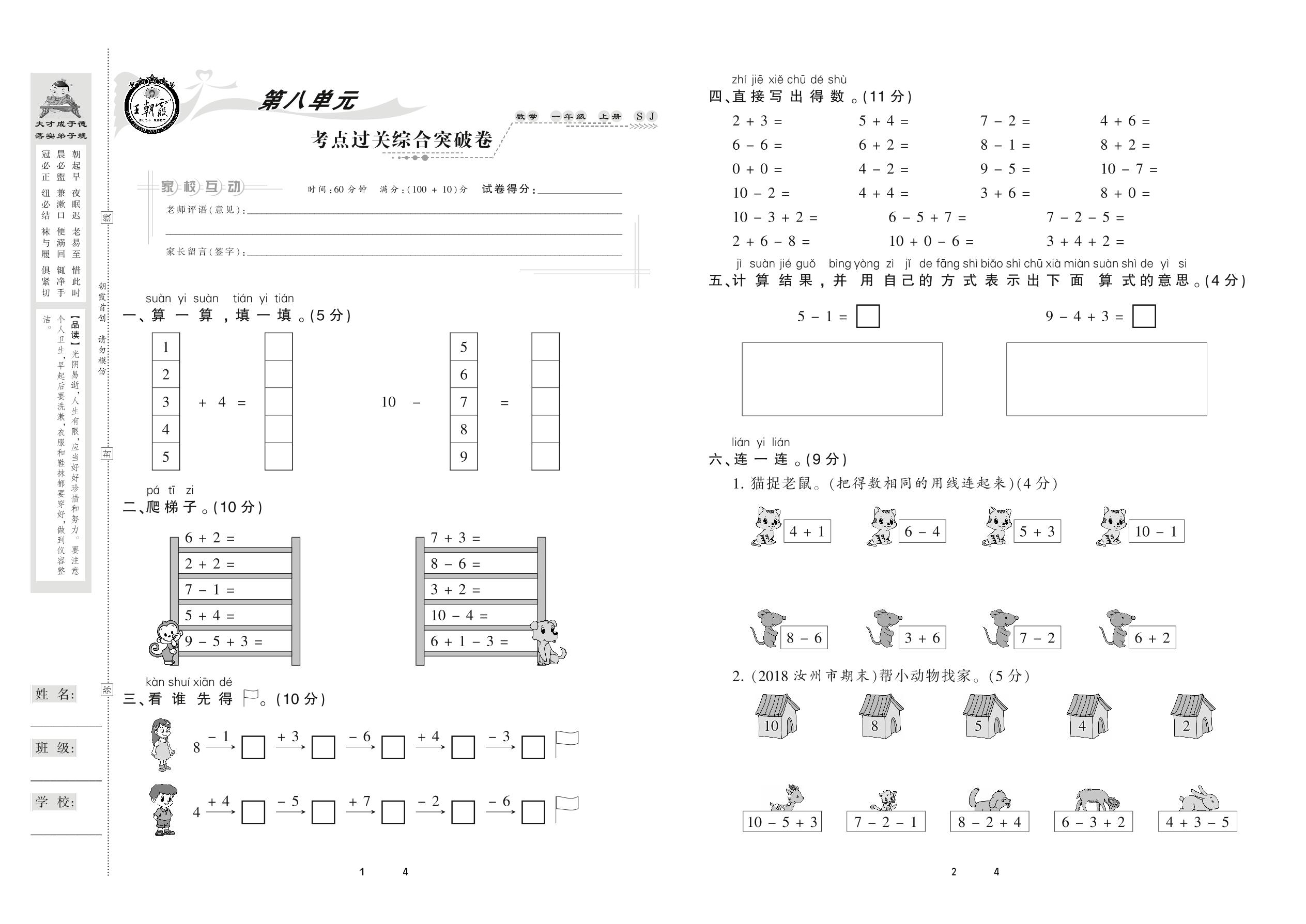 2020上册一年级数学苏教版 第八单元 考点过关综合突破卷