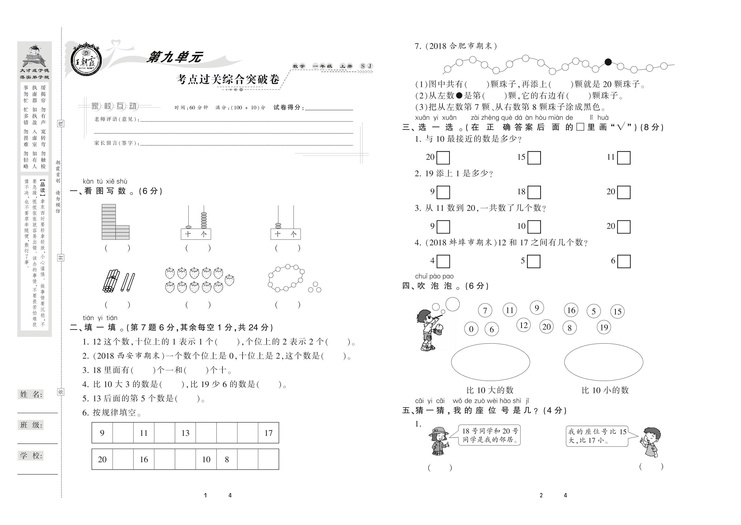2020上册一年级数学苏教版 第九单元 考点过关综合突破卷