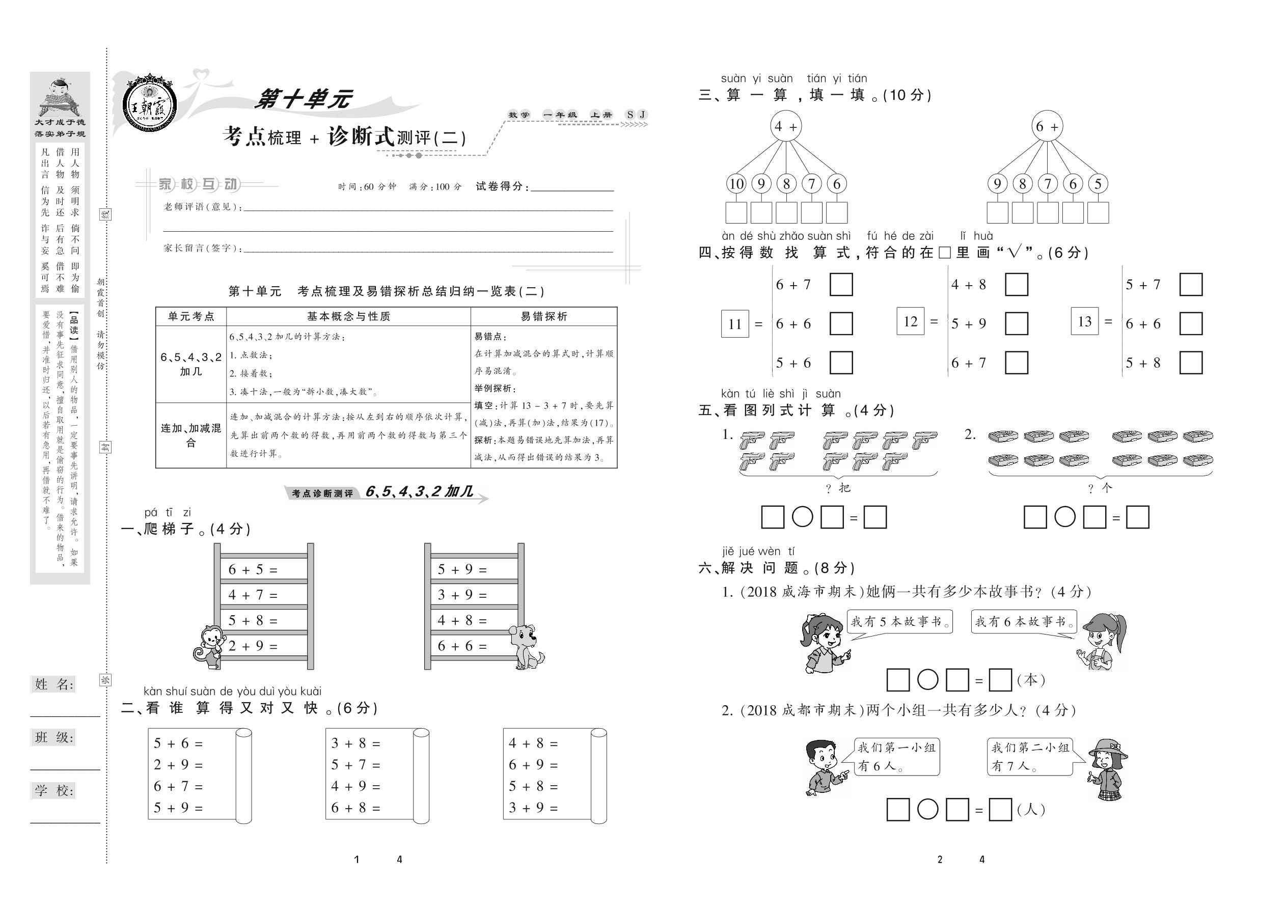 2020上册一年级数学苏教版 第十单元 考点梳理+诊断式测评(二)