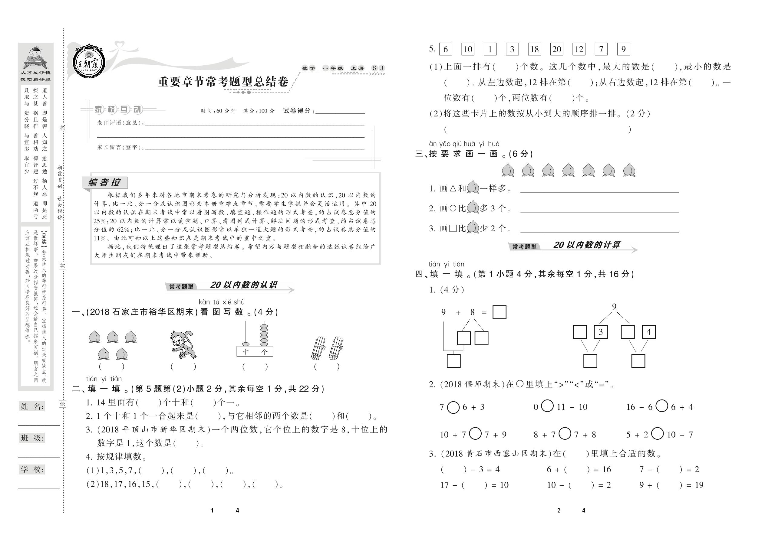 2020上册一年级数学苏教版 重要章节常考题型总结卷