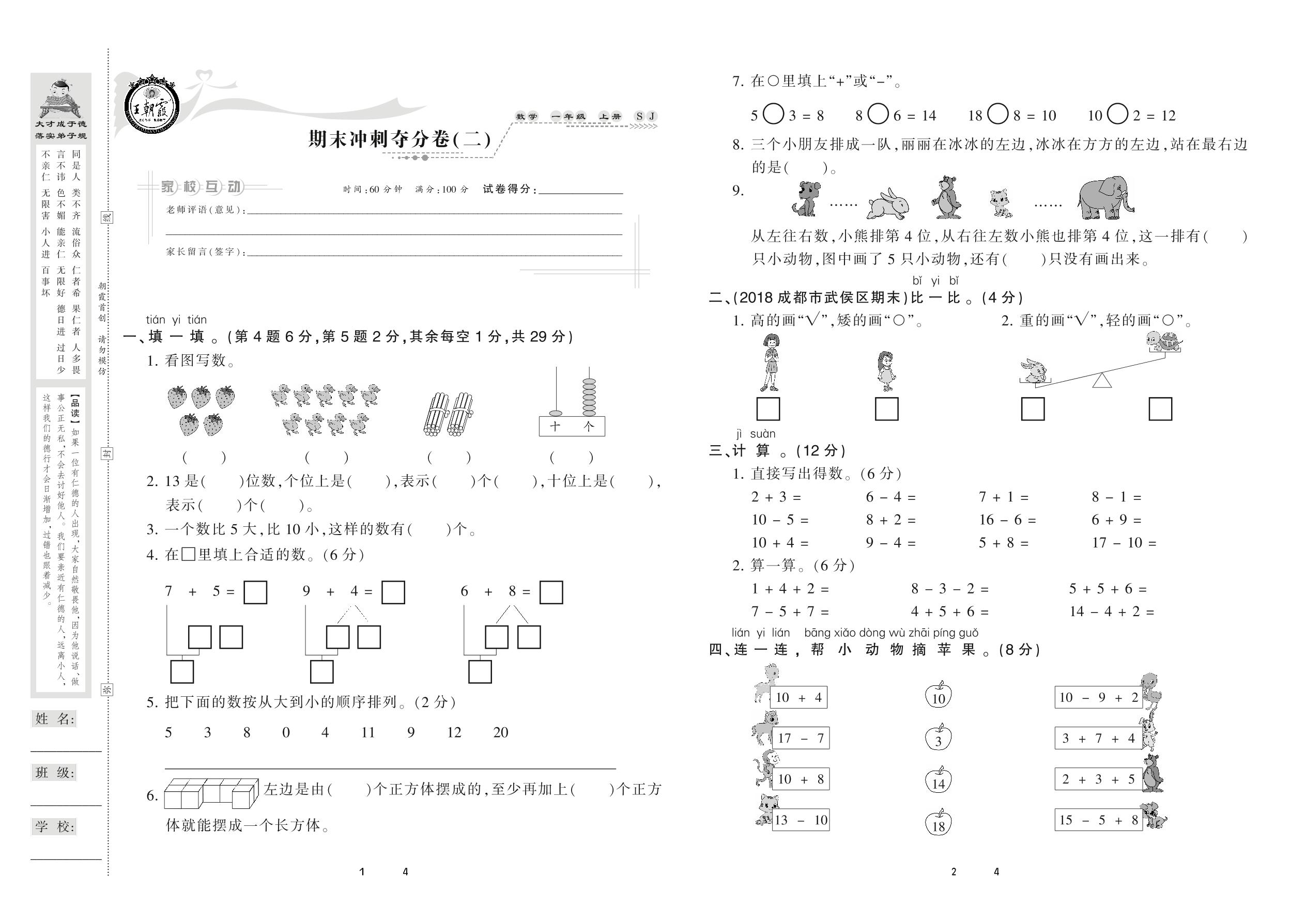 2020上册一年级数学苏教版 期末冲刺夺分卷(二)