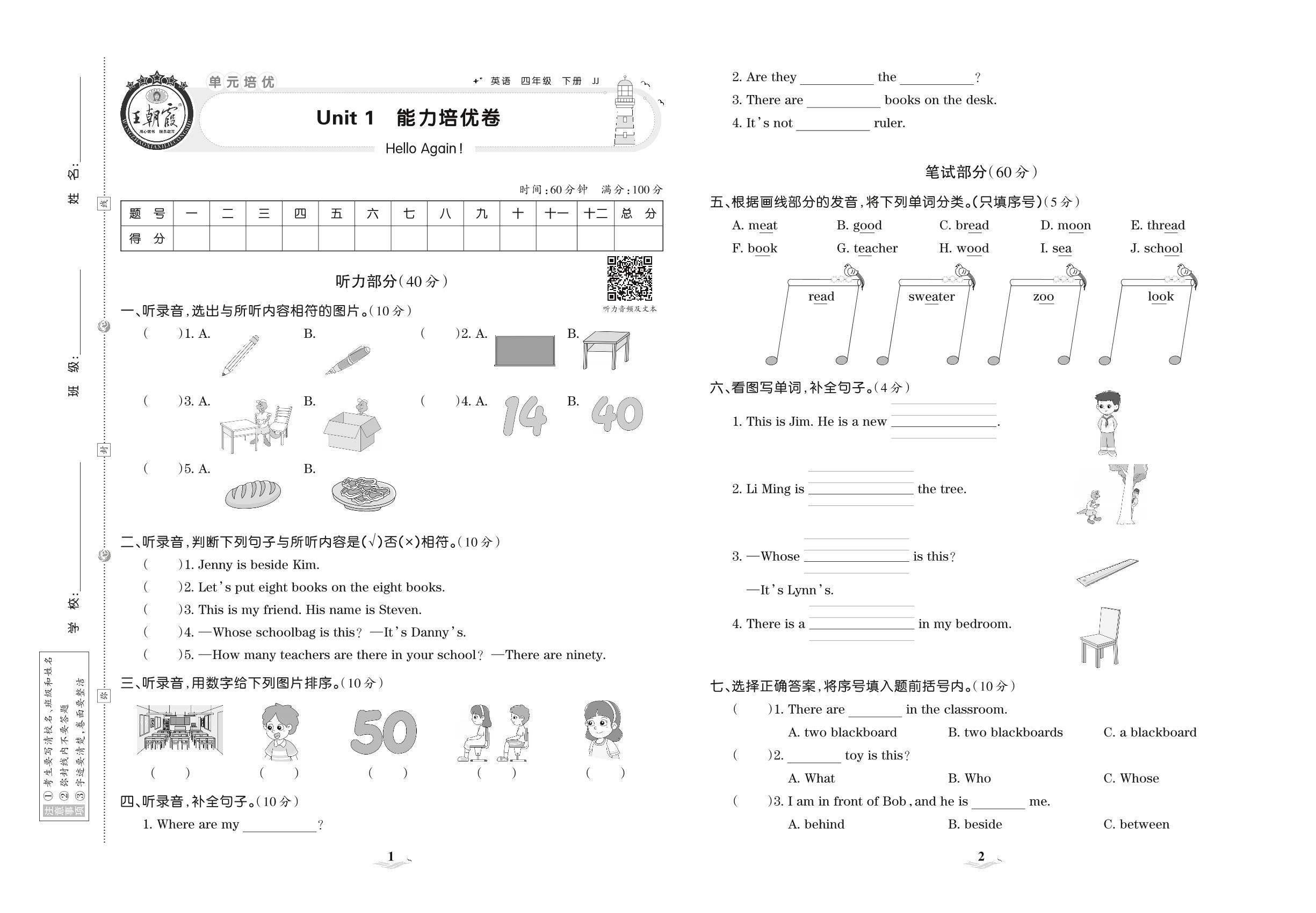 2021下册四年级英语冀教版 Unit 1 能力培优卷