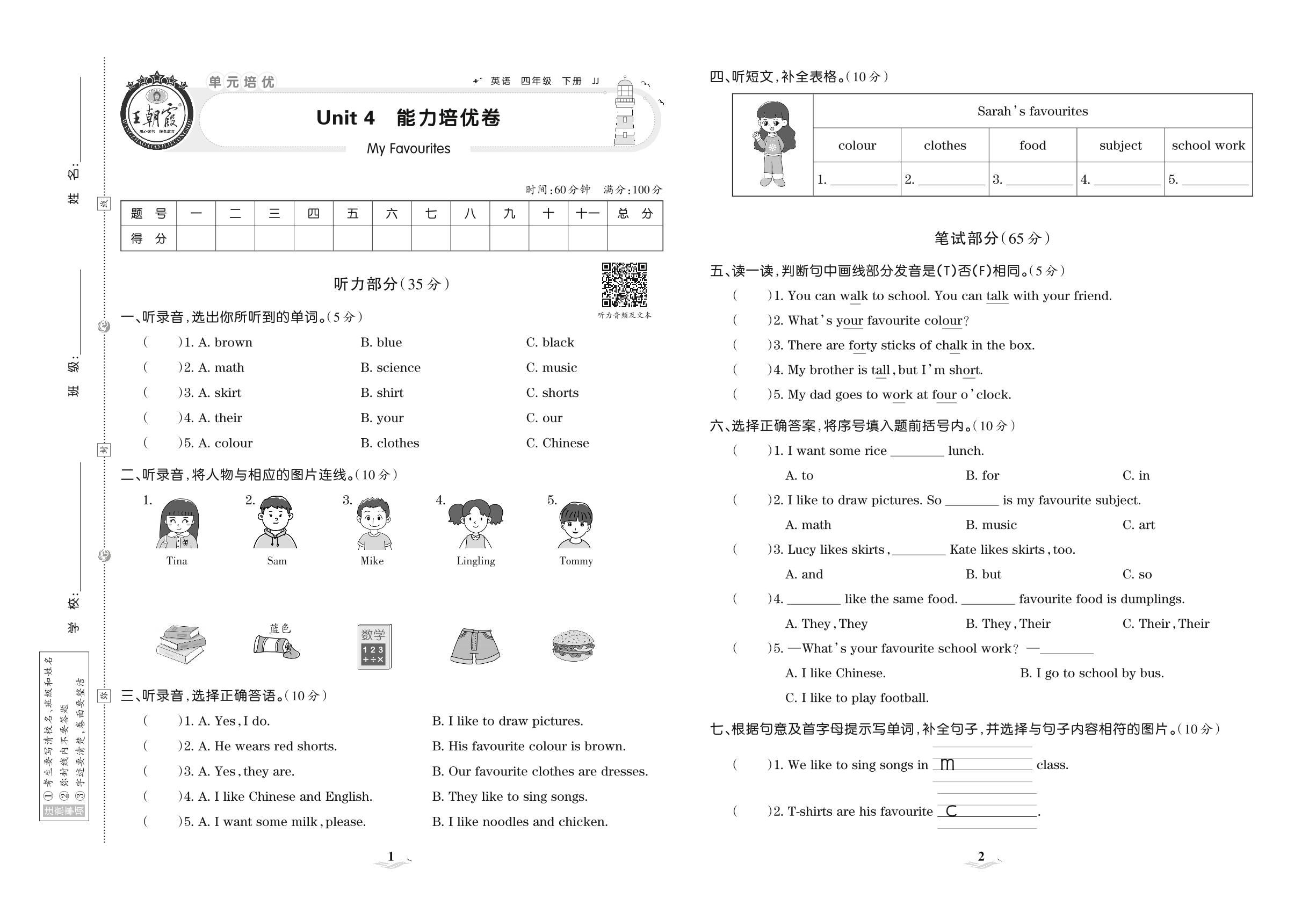 2021下册四年级英语冀教版 Unit 4 能力培优卷