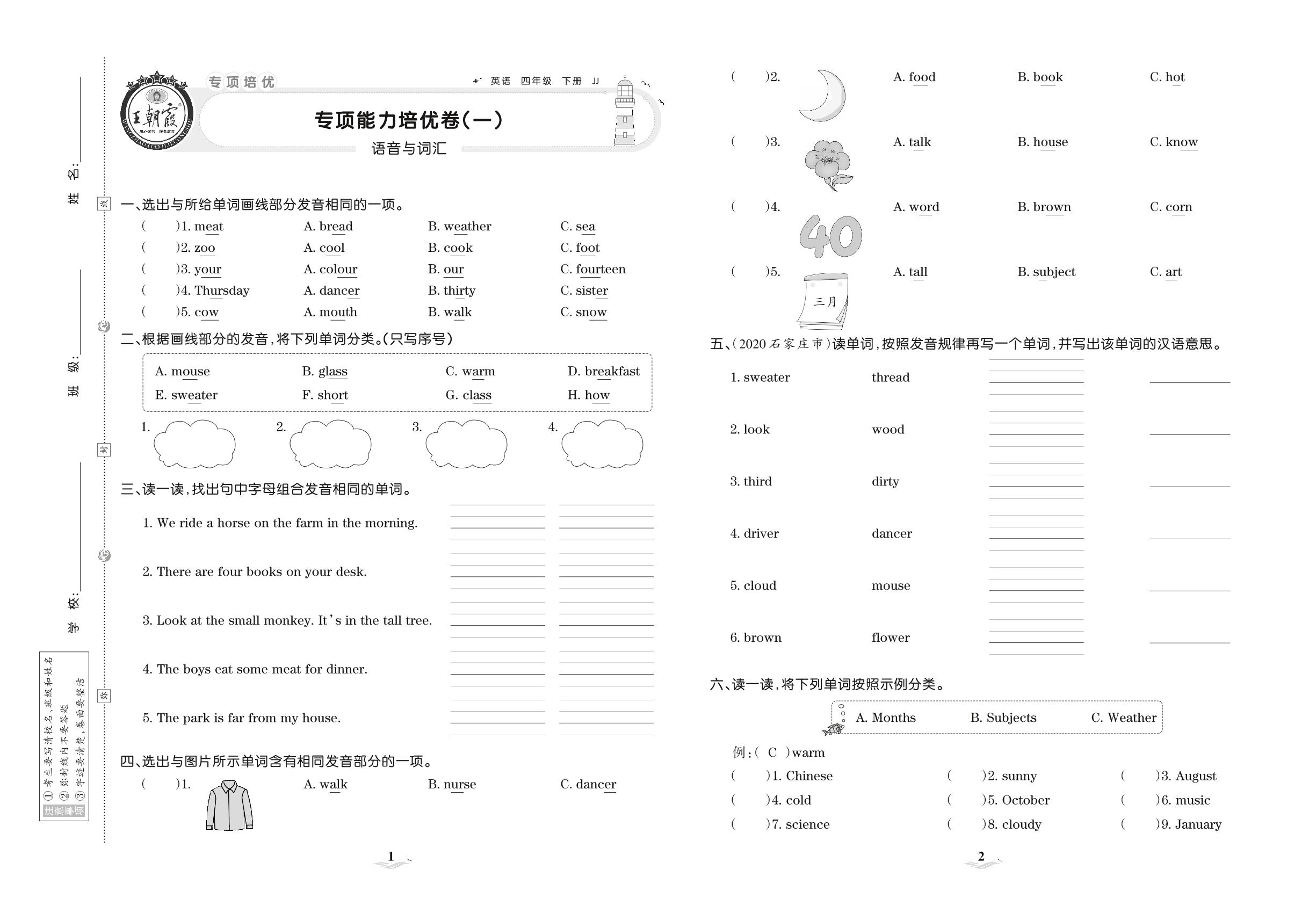 2021下册四年级英语冀教版 专项能力培优卷(一) 语音与词汇