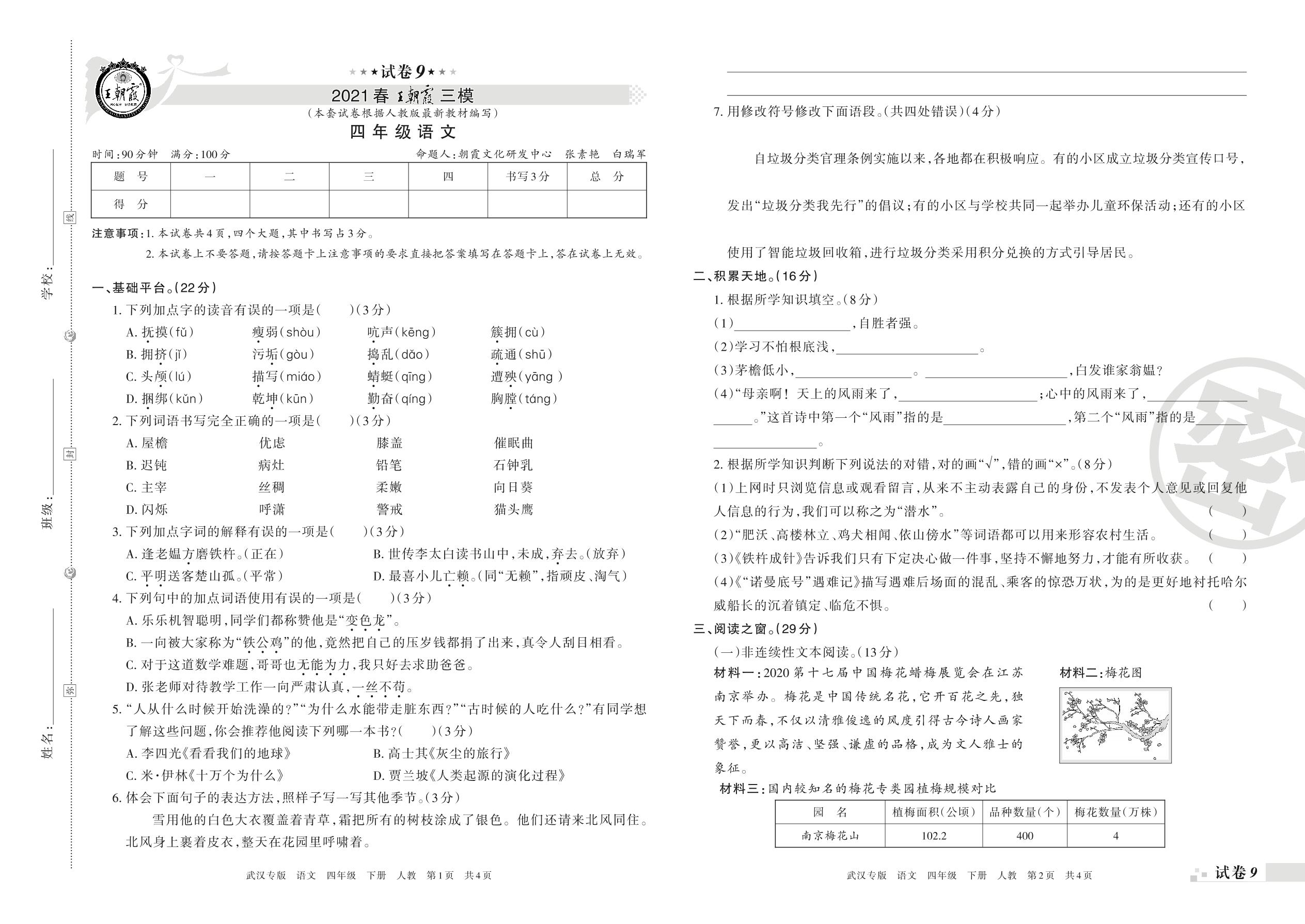 王朝霞期末模拟卷四年级下册语文(人教版)_R210801183623【9】