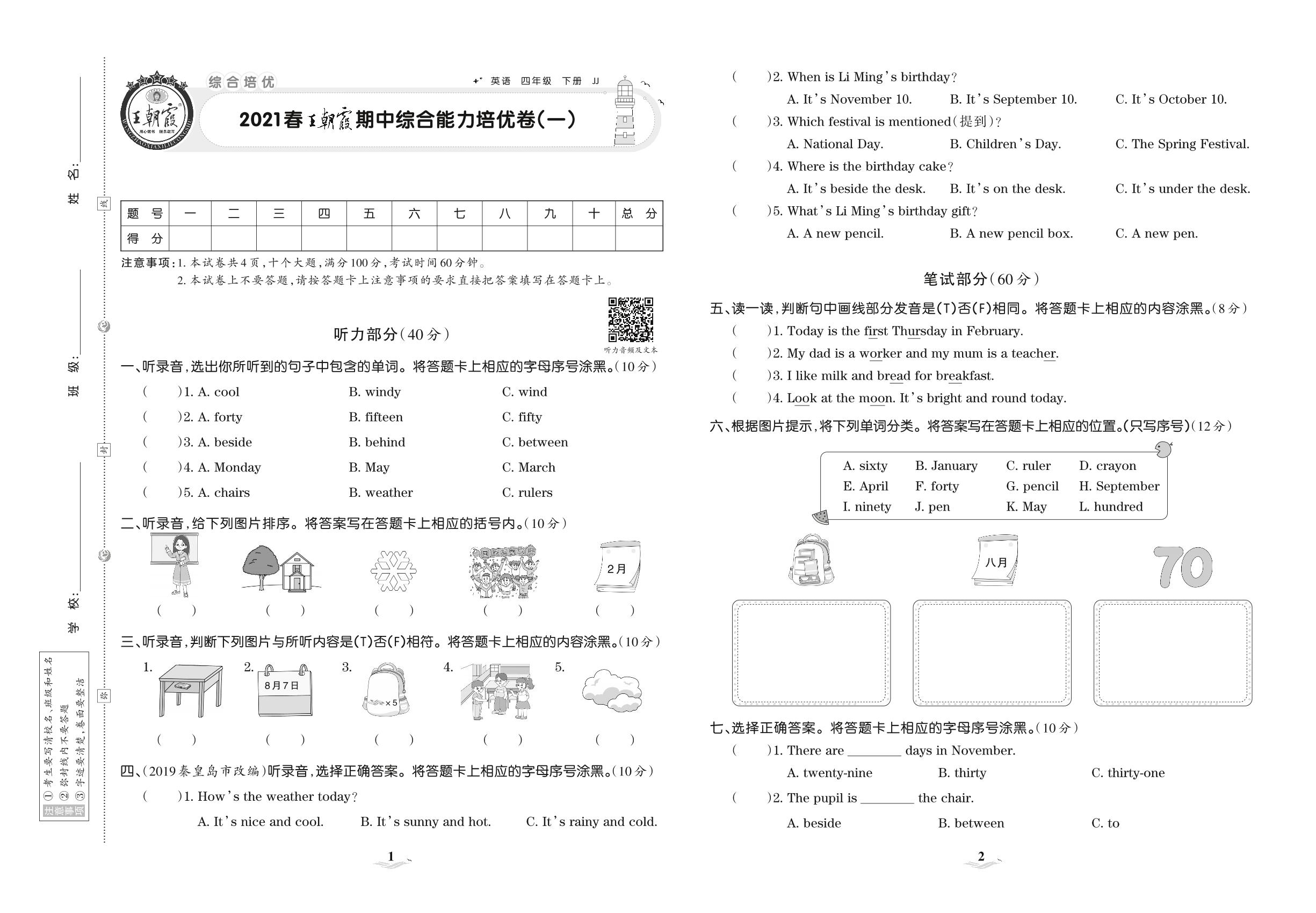 2021下册四年级英语冀教版 王朝霞期中综合能力培优卷(一)