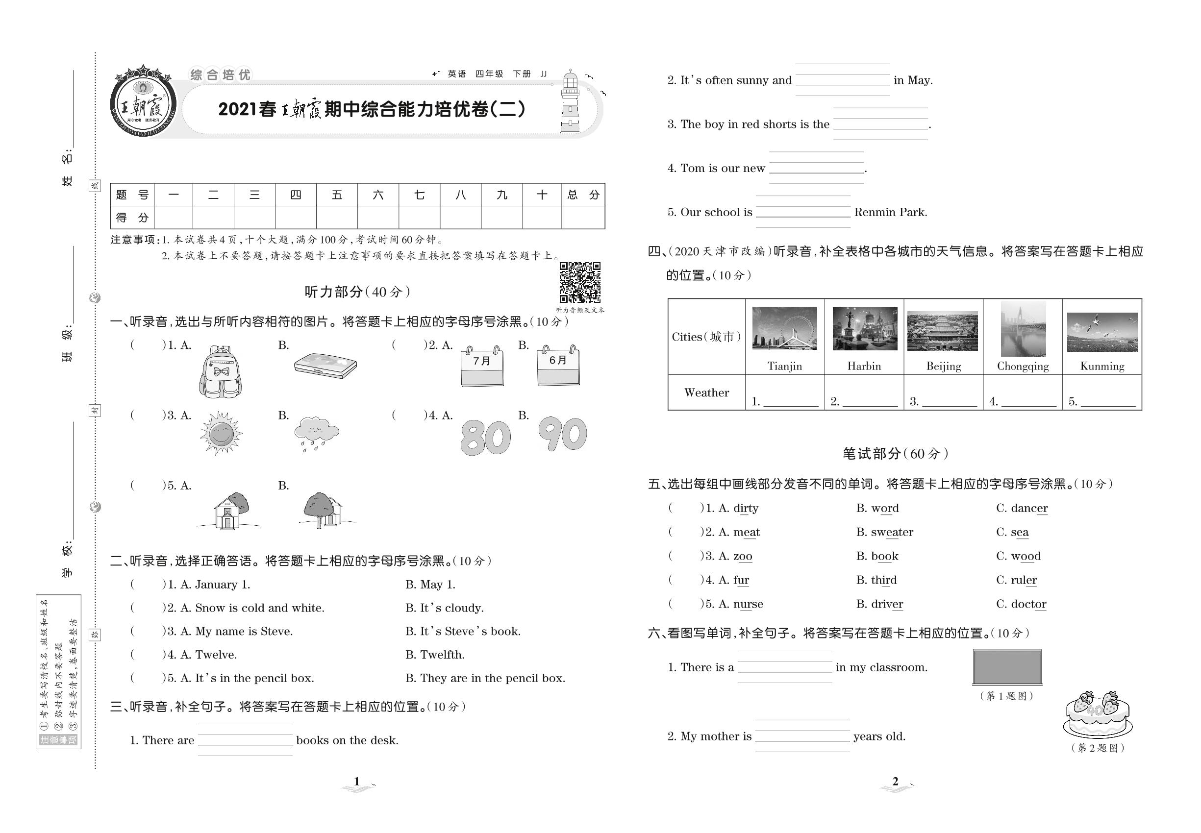2021下册四年级英语冀教版 王朝霞期中综合能力培优卷(二)
