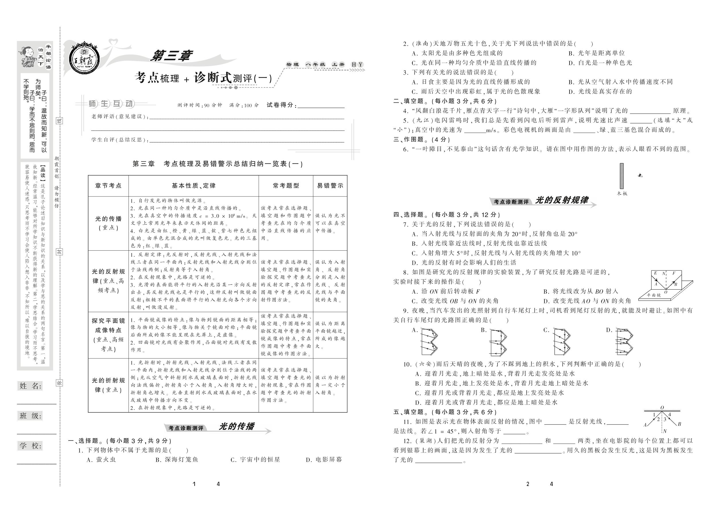 2020上册八年级物理沪粤版 第三章 考点梳理 + 诊断式测评(一)