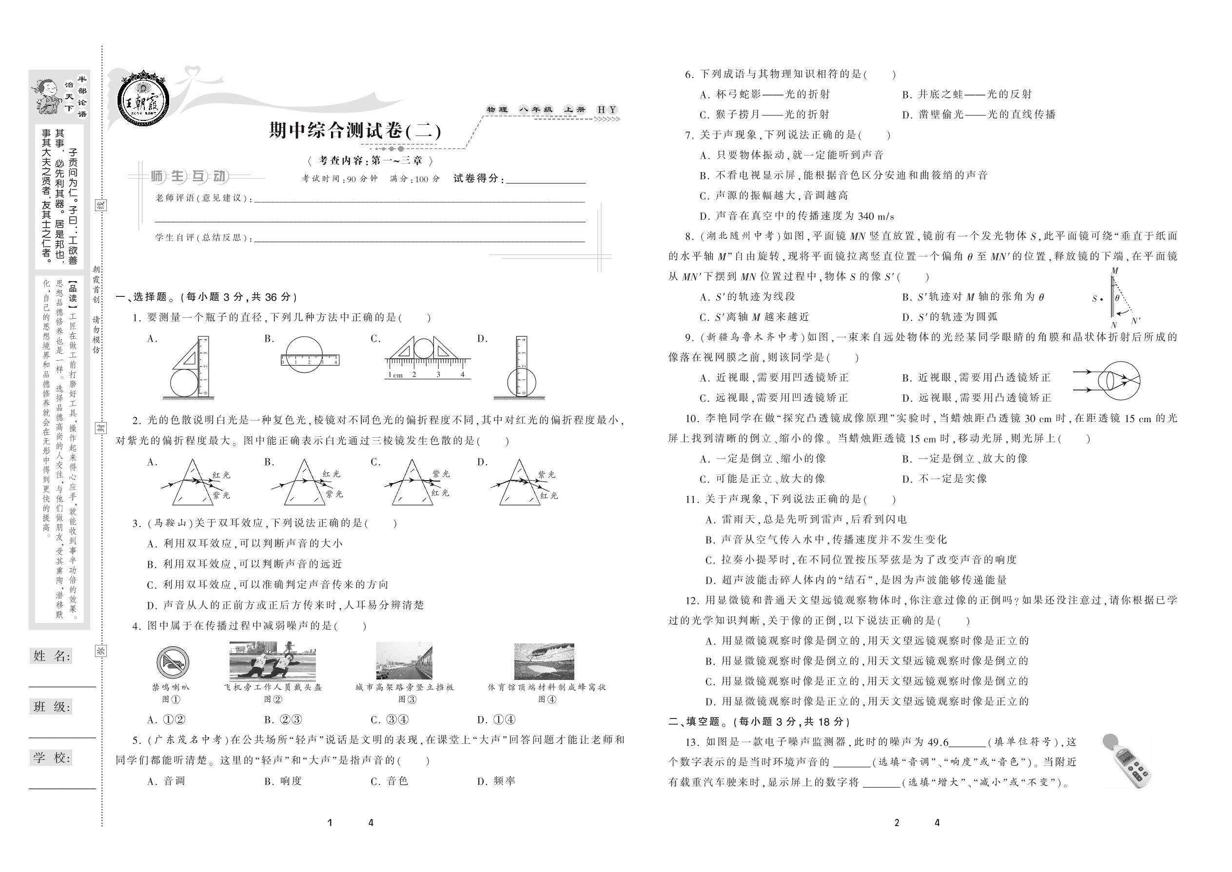 2020上册八年级物理沪粤版 期中综合测试卷(二)