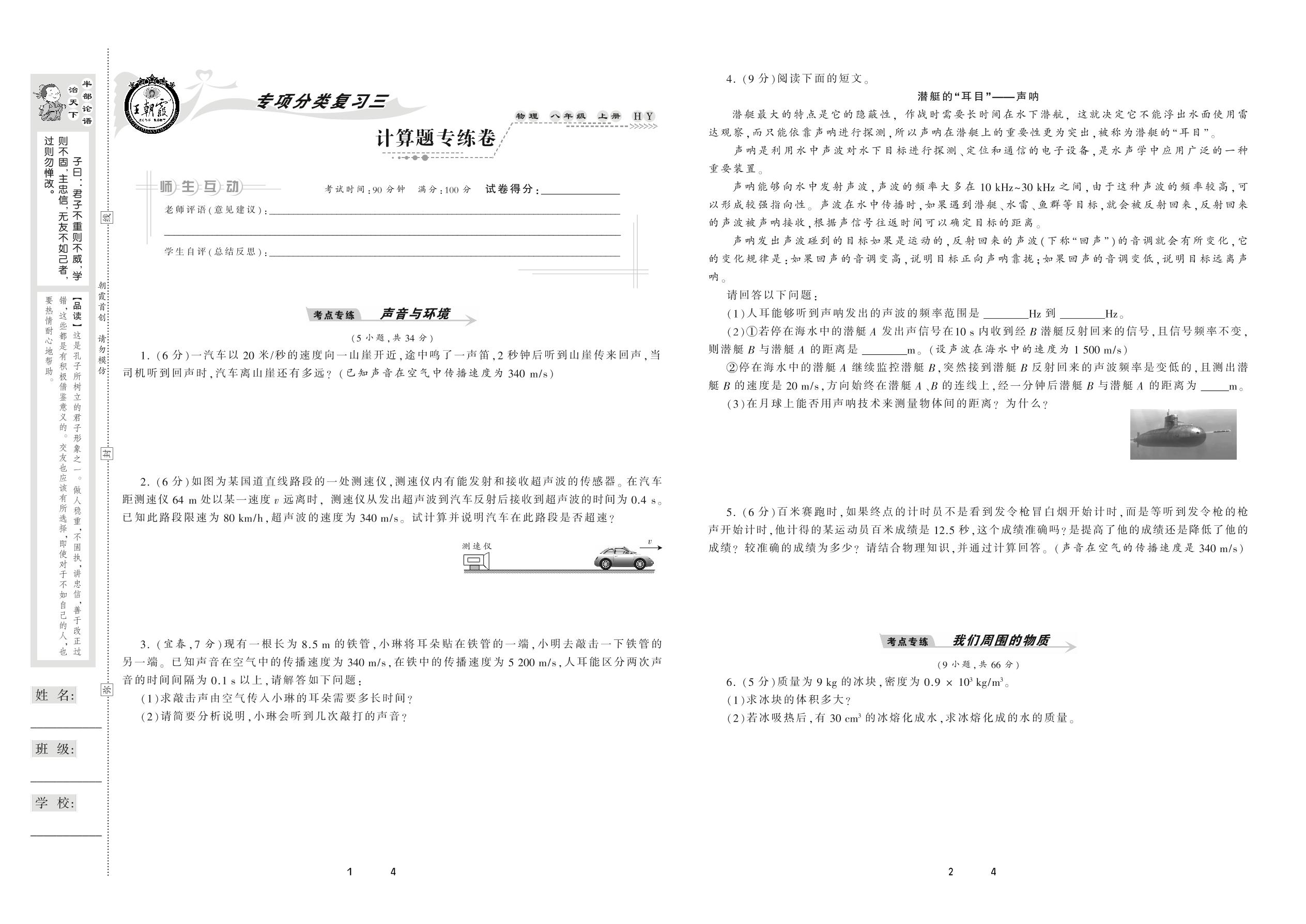 2020上册八年级物理沪粤版 专项分类复习三 计算题专练卷
