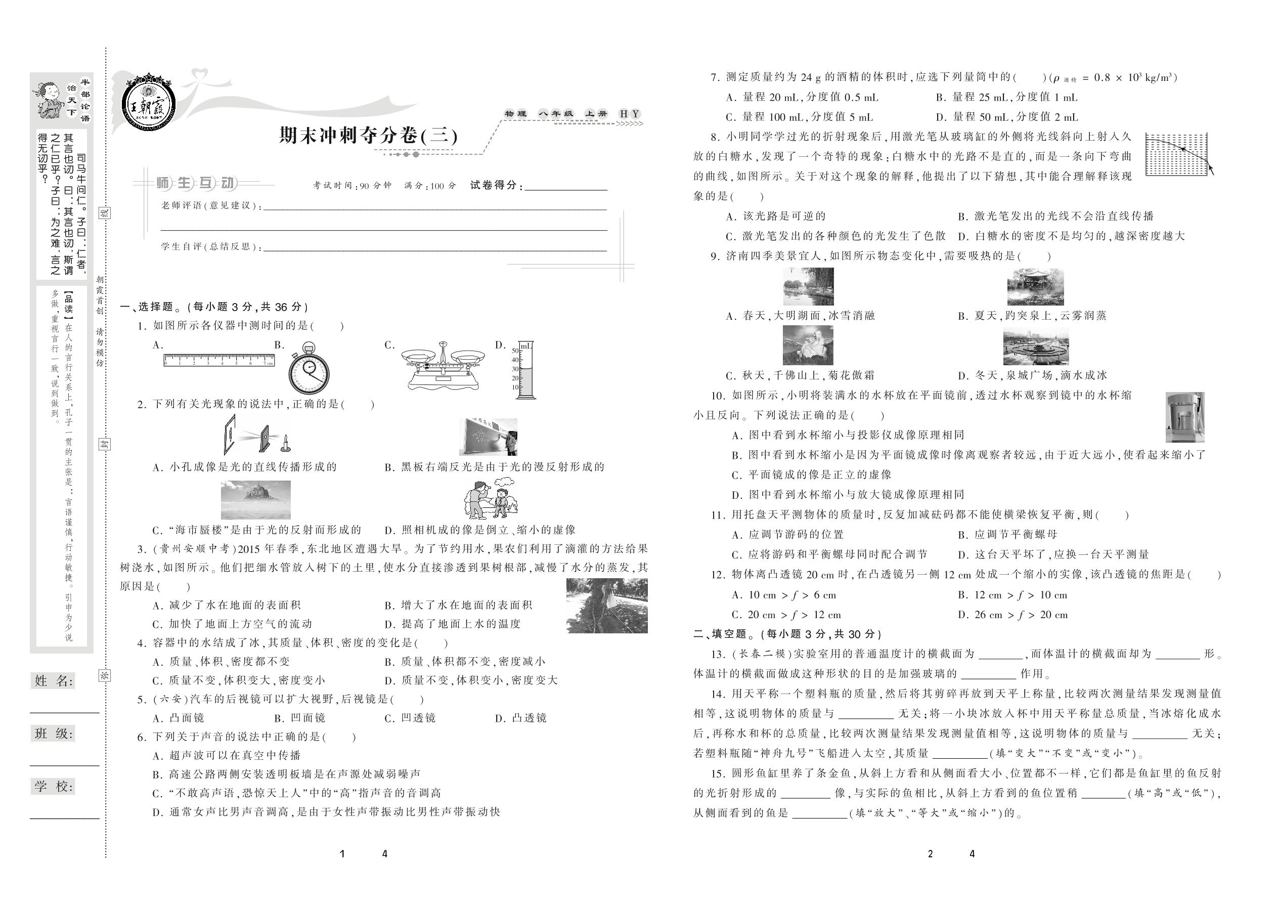 2020上册八年级物理沪粤版 期末冲刺夺分卷(三)