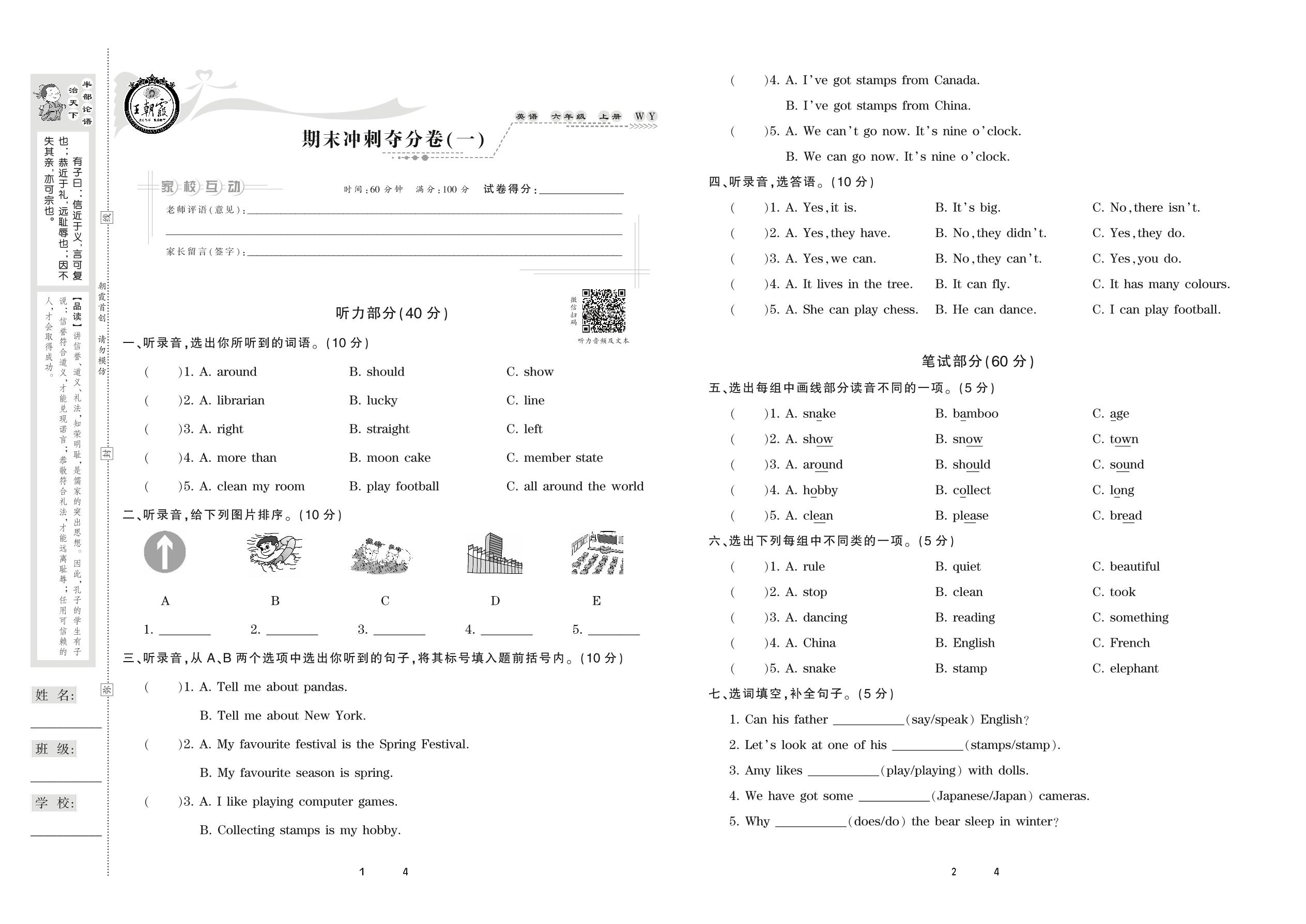 2020上册六年级英语外研版 期末冲刺夺分卷(一)