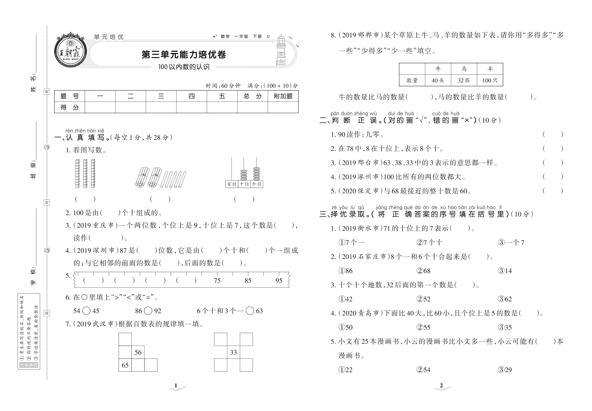 2021下册一年级数学冀教版 第三单元 能力培优卷