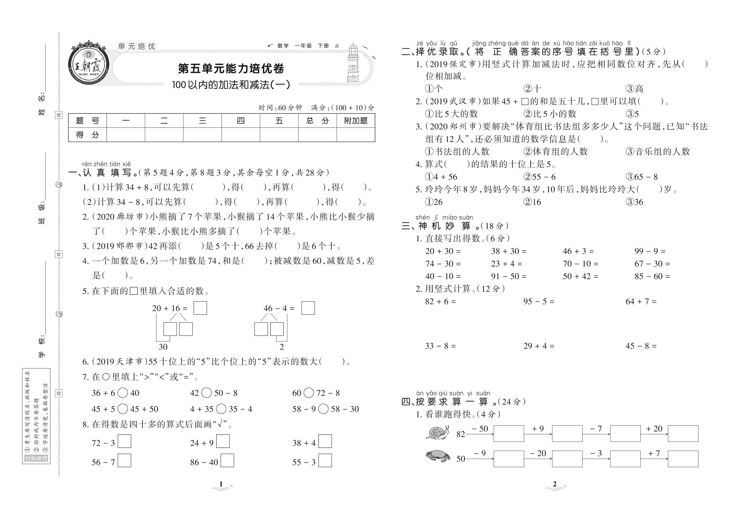 2021下册一年级数学冀教版 第五单元 能力培优卷