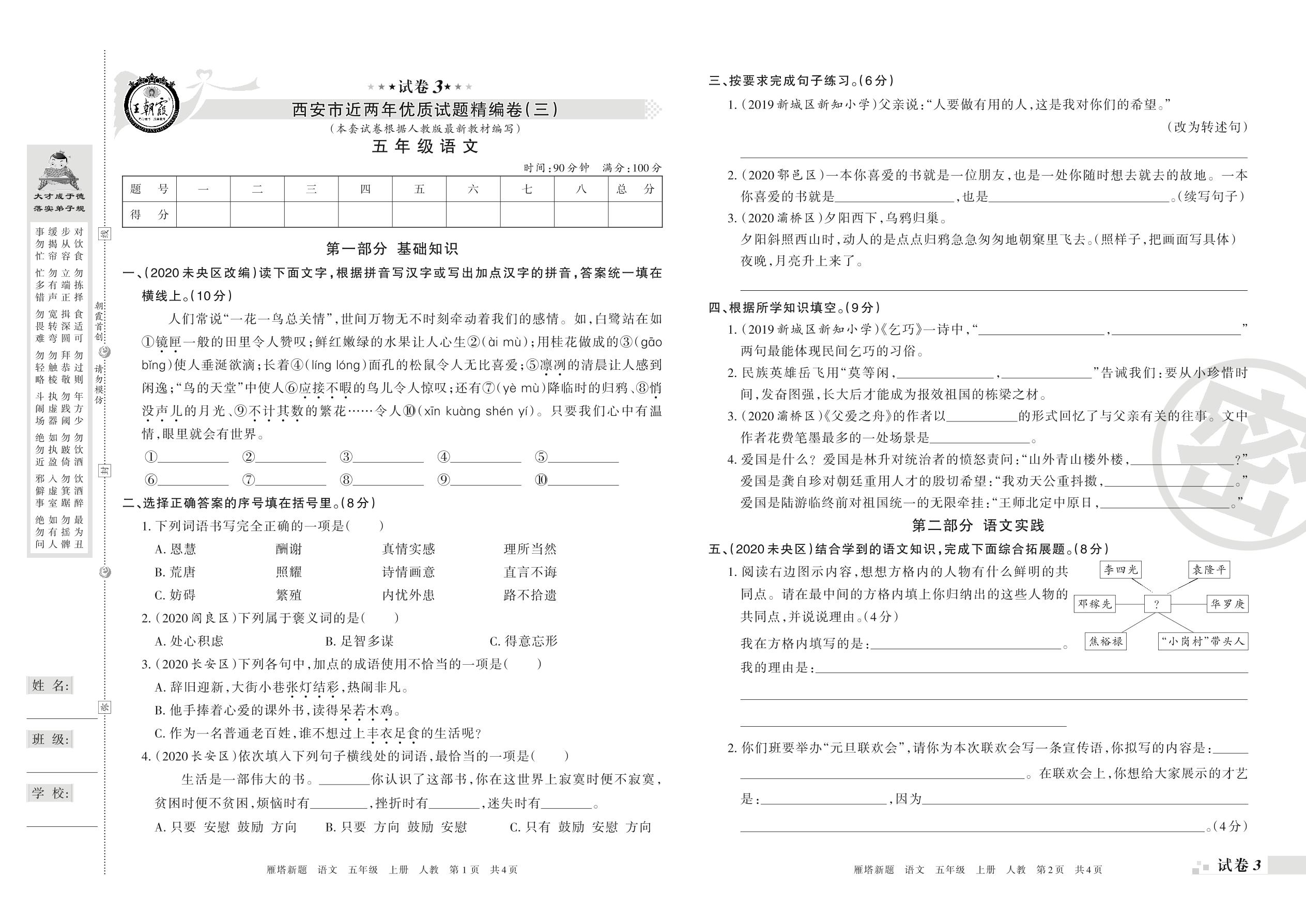 西安市近两年优质试题精编卷(三)五年级上册语文(人教版)【3】