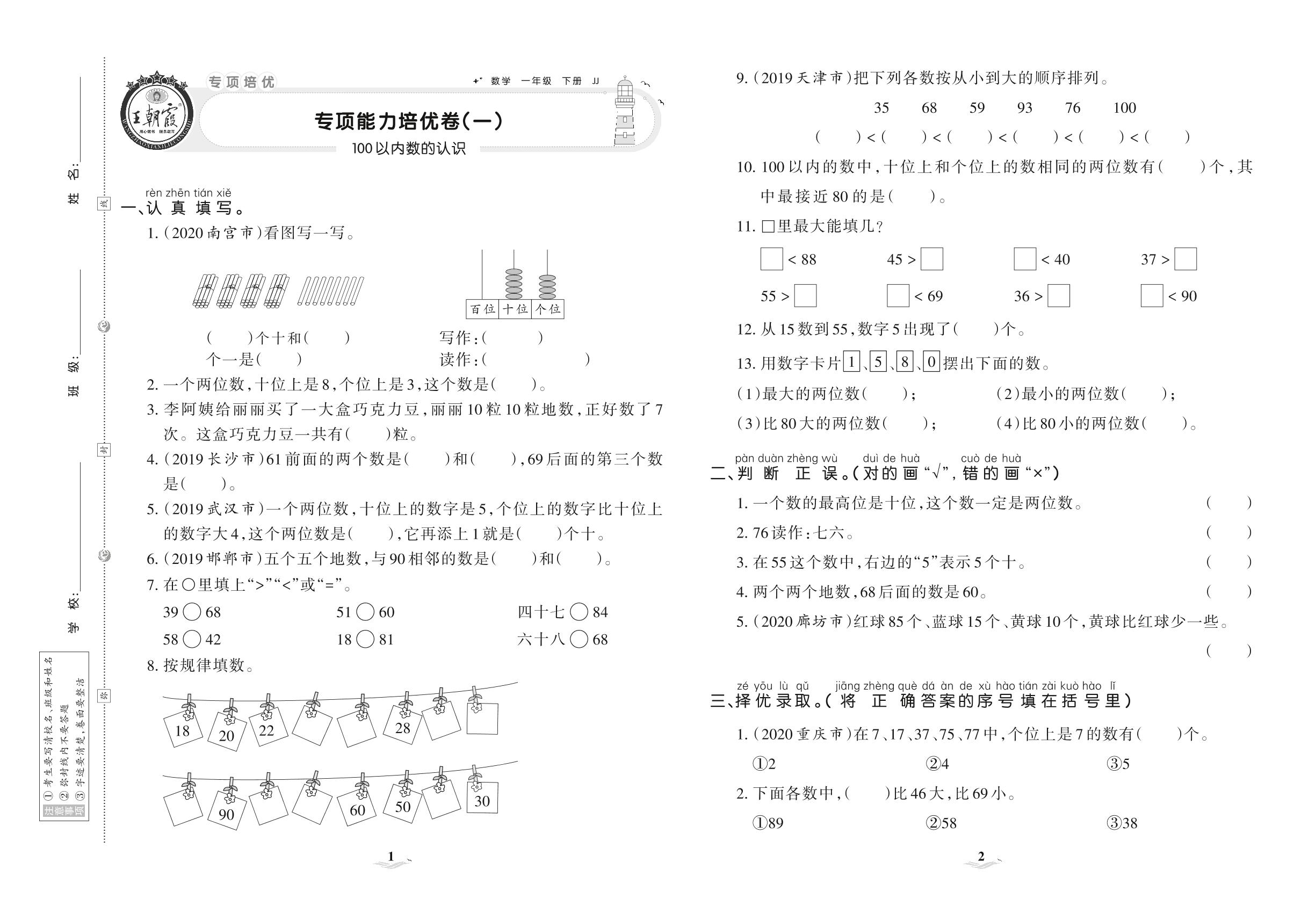 2021下册一年级数学冀教版 专项能力培优卷(一) 100以内数的认识