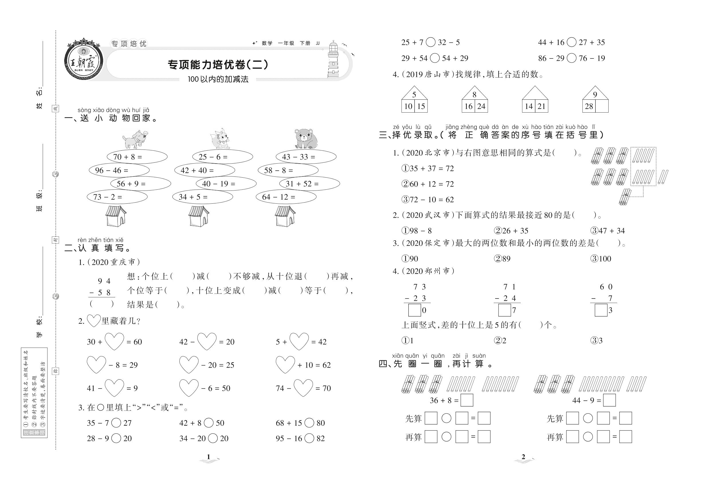 2021下册一年级数学冀教版 专项能力培优卷(二) 100以内的加减法