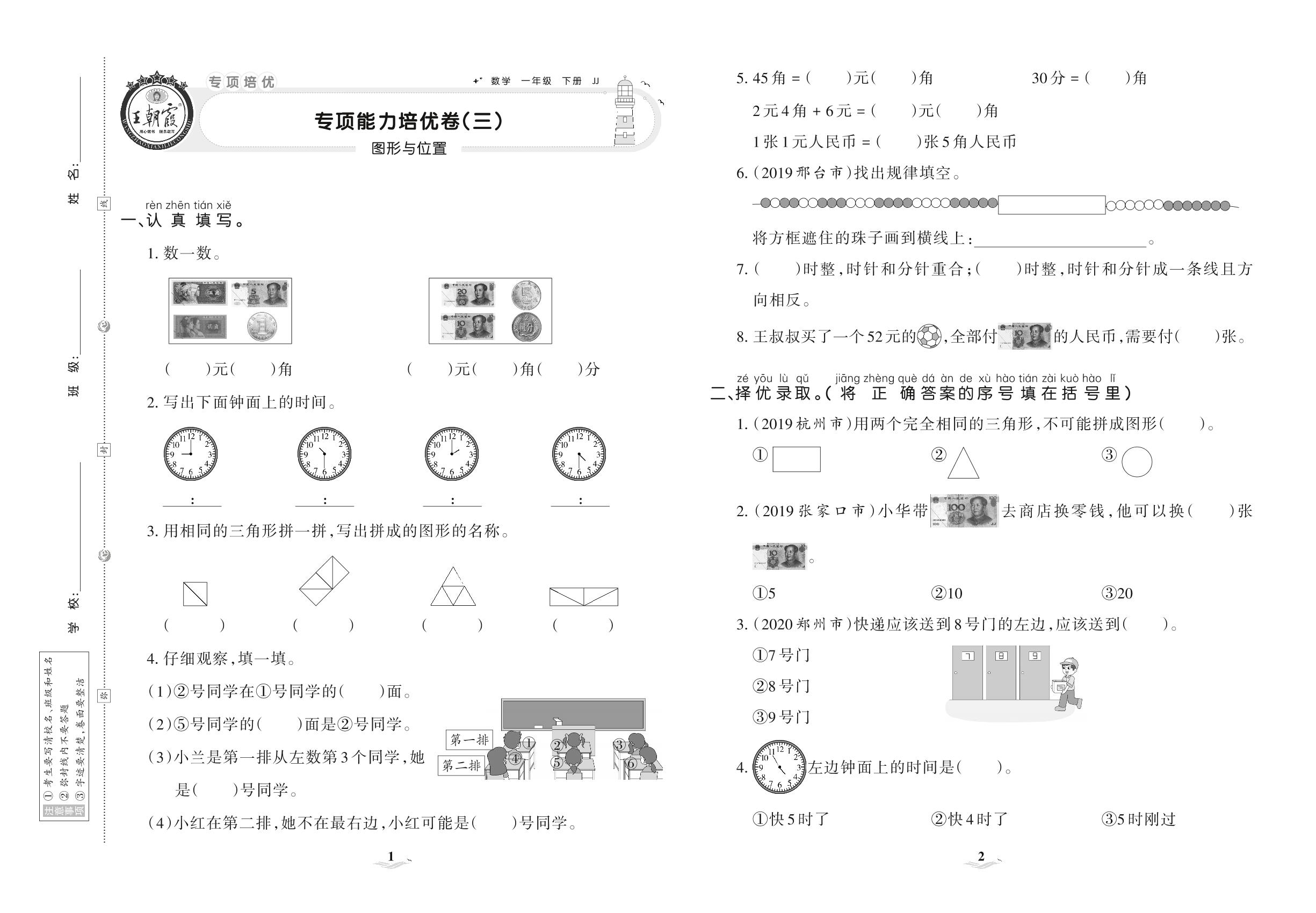 2021下册一年级数学冀教版 专项能力培优卷(三) 图形与位置