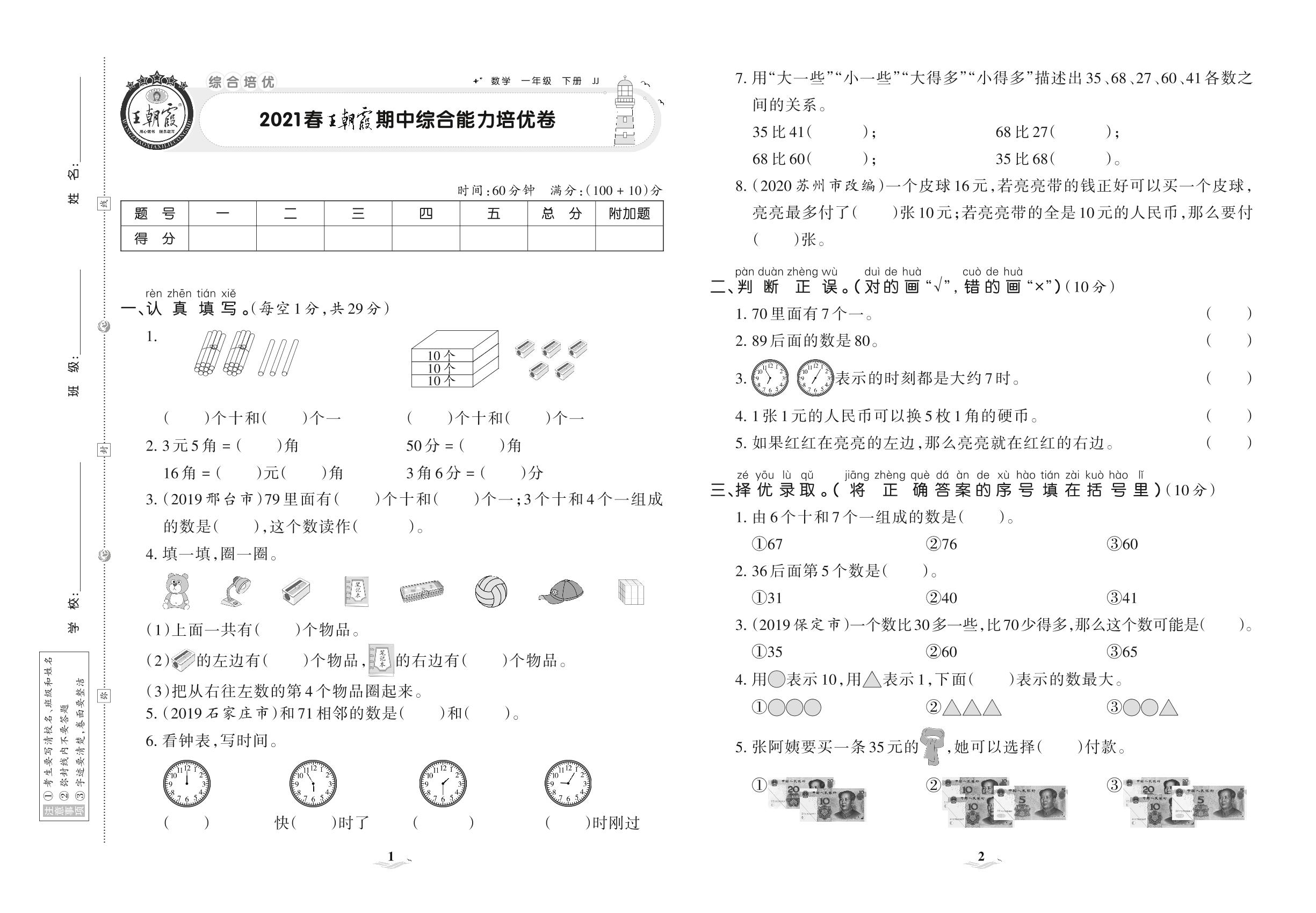 2021下册一年级数学冀教版 王朝霞期中综合能力培优卷