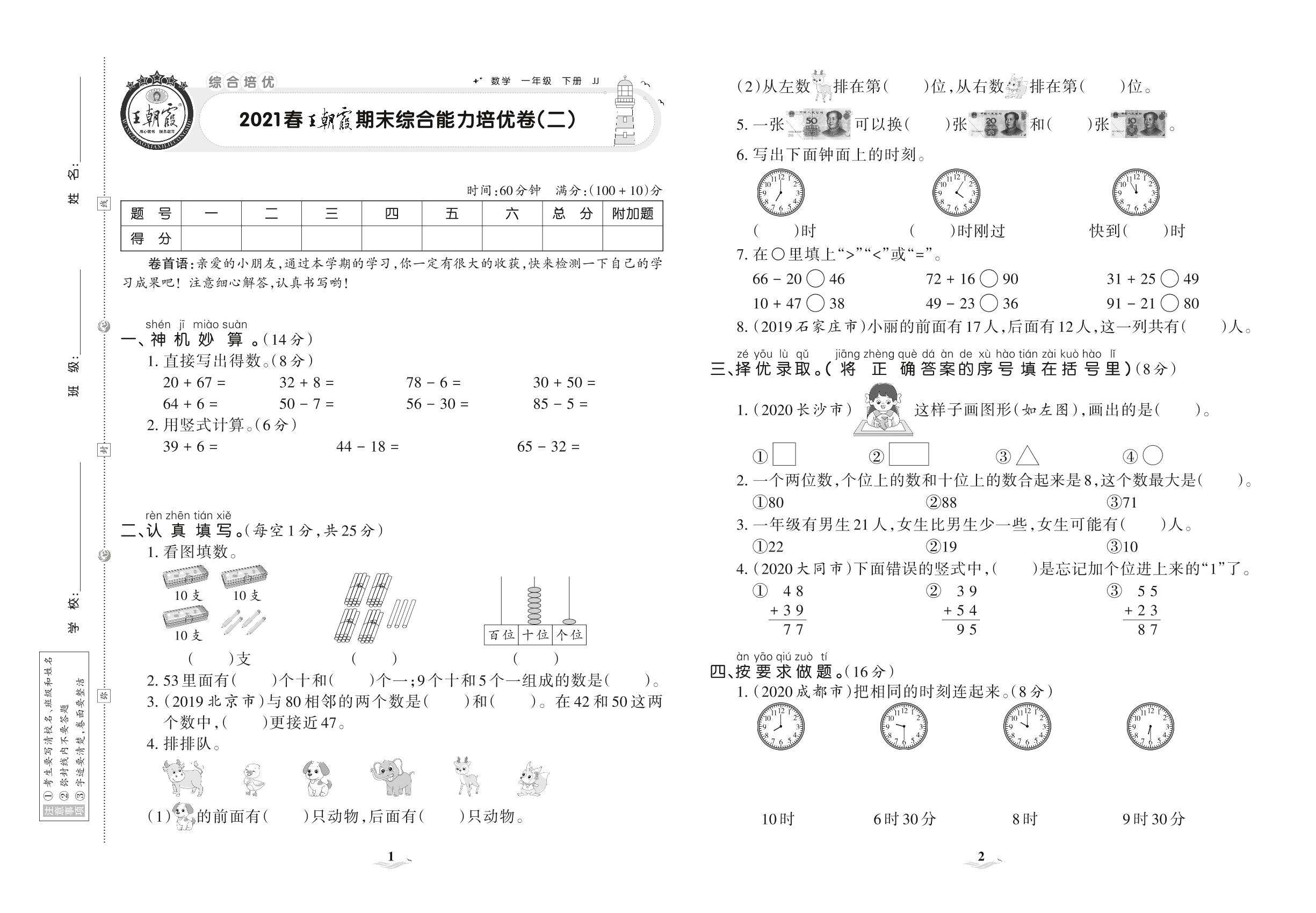 2021下册一年级数学冀教版 王朝霞期末综合能力培优卷(二)