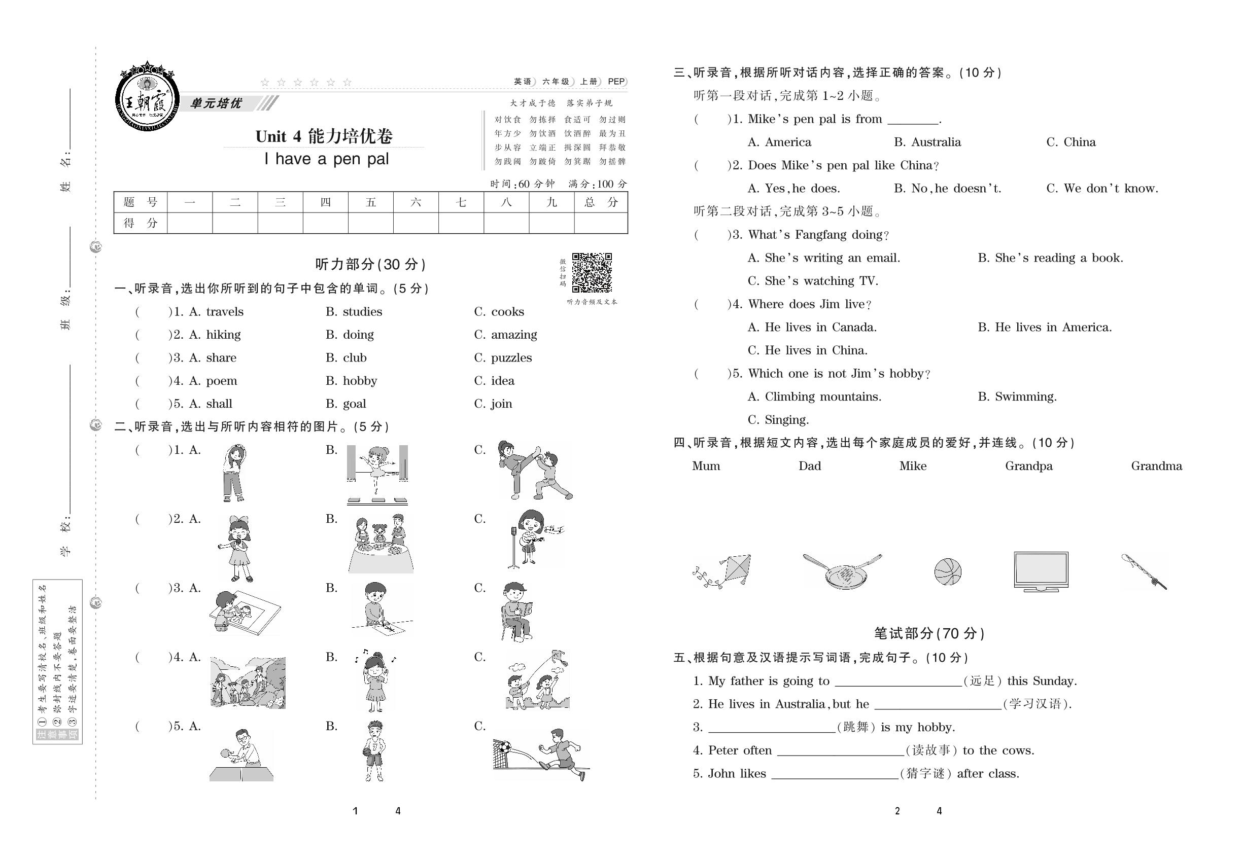 2020上册六年级英语PEP版 Unit 4 能力培优卷