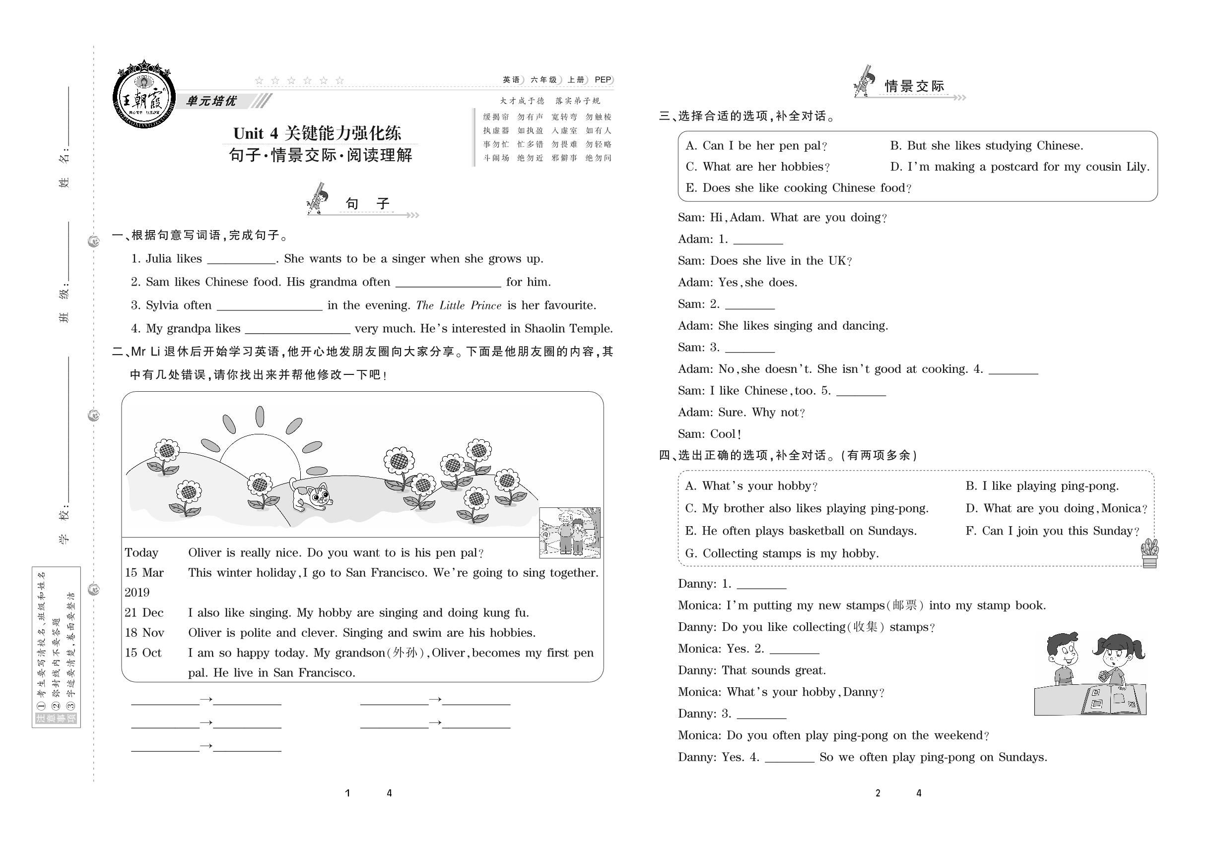 2020上册六年级英语PEP版 Unit 4 关键能力强化练