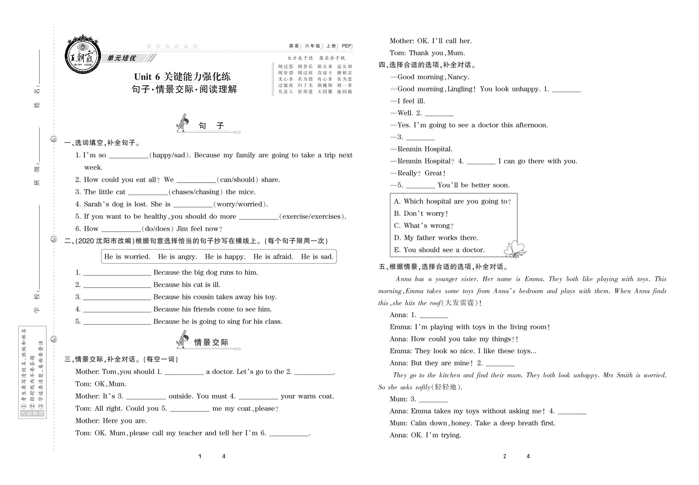 2020上册六年级英语PEP版 Unit 6 关键能力强化练