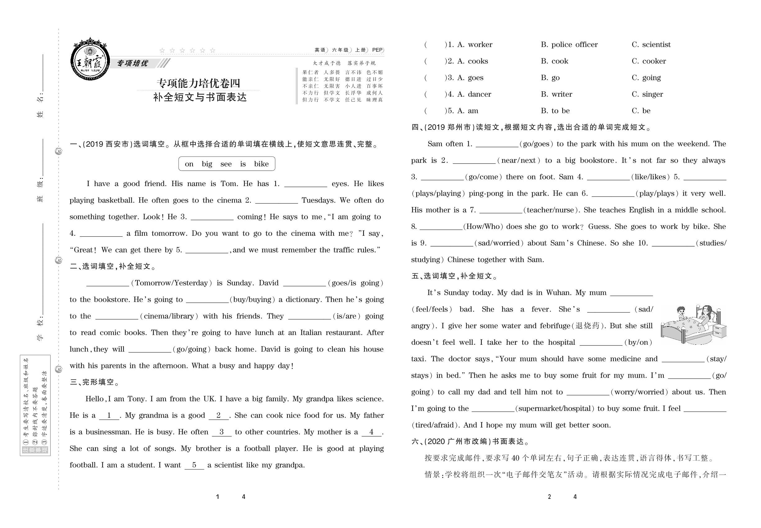 2020上册六年级英语PEP版 专项能力培优卷四 补全短文与书面表达