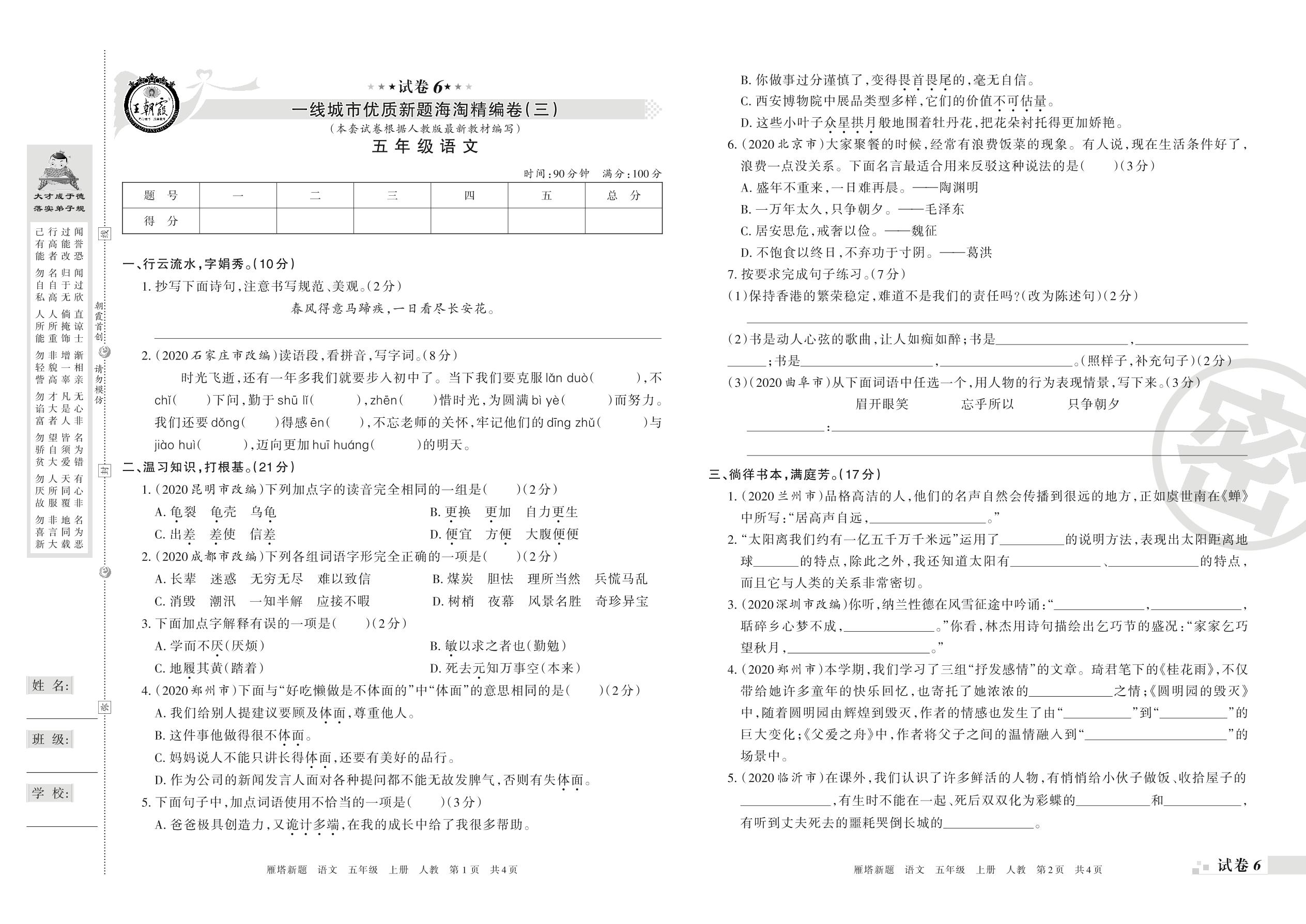 王朝霞海淘期末精编卷五年级上册语文(人教版)【6】